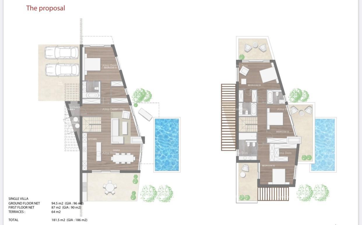 Each has 4 bedrooms (each room has a balcony), 4 bathrooms, a living room, a terrace, 2 parking spaces, and a swimming pool.