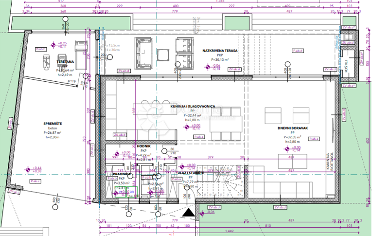 *Wohnzimmer mit Esszimmer und Küche, Toilette, Waschküche, Abstellraum, Fitnessraum und überdachte Terrasse.