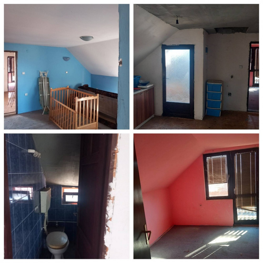 Na spratu ima dve spavaće sobe,malo kupatilo,dnevna soba,kuhinja odvojena u drugoj prostoriji...