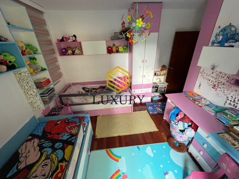 Dvosoban stan smješten na prvom spratu stambene zgrade koja se nalazi ispod Gporice. Stan je zaklonjen od gradske buke i gleda na brdo. Sproveden je centralni sistem grijanja. Bravarija i parketi su od trešnje. Stan je prostran i komotan, smješten je u uglu zgrade koja je relativno mlada i posjeduje dva parking mjesta obezbijedjena videonadzorom. Kvadratura stana je 90m2 i uključuje dvije terase.