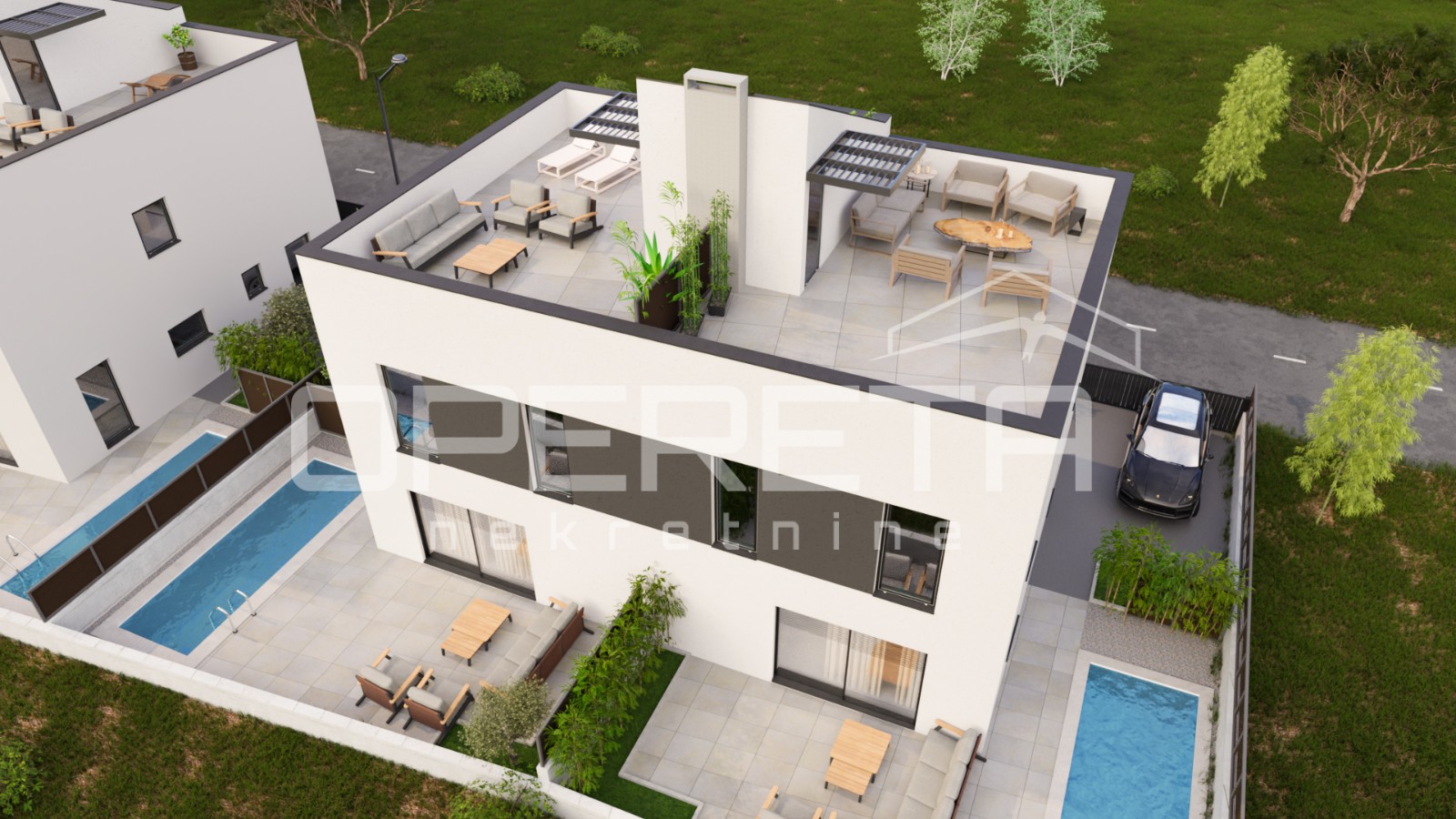 Beschreibung: Istrien, Peroj: Neubau-Doppelhaushälfte in bester Lage in ruhiger Lage von Peroj, nur 1,5 km von den Stränden entfernt!Zwei Wohneinheiten stehen zum Verkauf.Haus (Wohnung) – S1 und S2, jeweils mit einer Nettowohnfläche von 116 m², davon 98 m² Wohnfläche.Im Erdgeschoss befinden sich eine Küche mit Essbereich, ein Wohnzimmer mit Zugang zum Garten, ein Flur, ein kleines Schlafzimmer und ein Badezimmer.Im Obergeschoss befinden sich zwei Schlafzimmer, ein Badezimmer und ein Flur mit Zugang zu einer 44 m² großen Dachterrasse mit herrlichem Meerblick.Modernes und schlichtes Design.18 m² großer Swimmingpool90 m² großer Garten.Stellplatz.Möbel sind nicht im Preis inbegriffen.Voraussichtlicher Baubeginn: Februar 2026.*Asphaltierte Zufahrt*Beim Bau werden moderne und hochwertige Materialien verwendet. *Nachdem der Käufer sein Interesse bekundet hat, erhält er eine Liste der während des Baus verwendeten Materialien.Der interessierte Käufer kann sich aktiv am Bauprozess beteiligen, indem er Materialien, Farben und Ausstattung auswählt.Der Verkäufer ist ein umsatzsteuerpflichtiges Unternehmen....