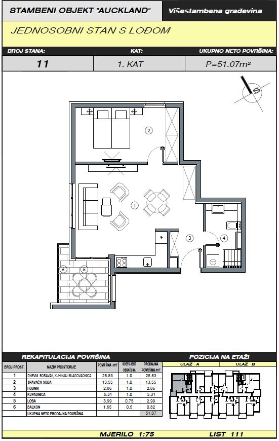 S11 (1. kat) jednosoban stan površine 51,07 m2 x 3.300,00 EUR/m2 = 168.531,00 EUR