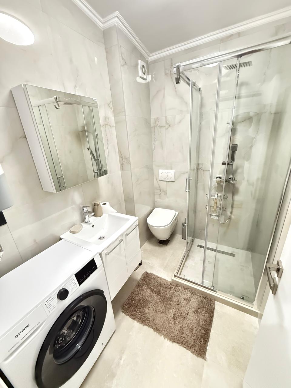 Die Wohnung ist komplett möbliert und mit neuen Geräten ausgestattet (alles mit Garantie): Backofen, Geschirrspüler, Waschmaschine, großer Fernseher. Es gibt Klimaanlagen, elektrische Rollläden mit Fernbedienung und Insektenschutzgitter an den Fenstern. Der Eingangsbereich des Hauses besticht durch große Fenster von Boden bis Decke mit Blick auf das Meer.