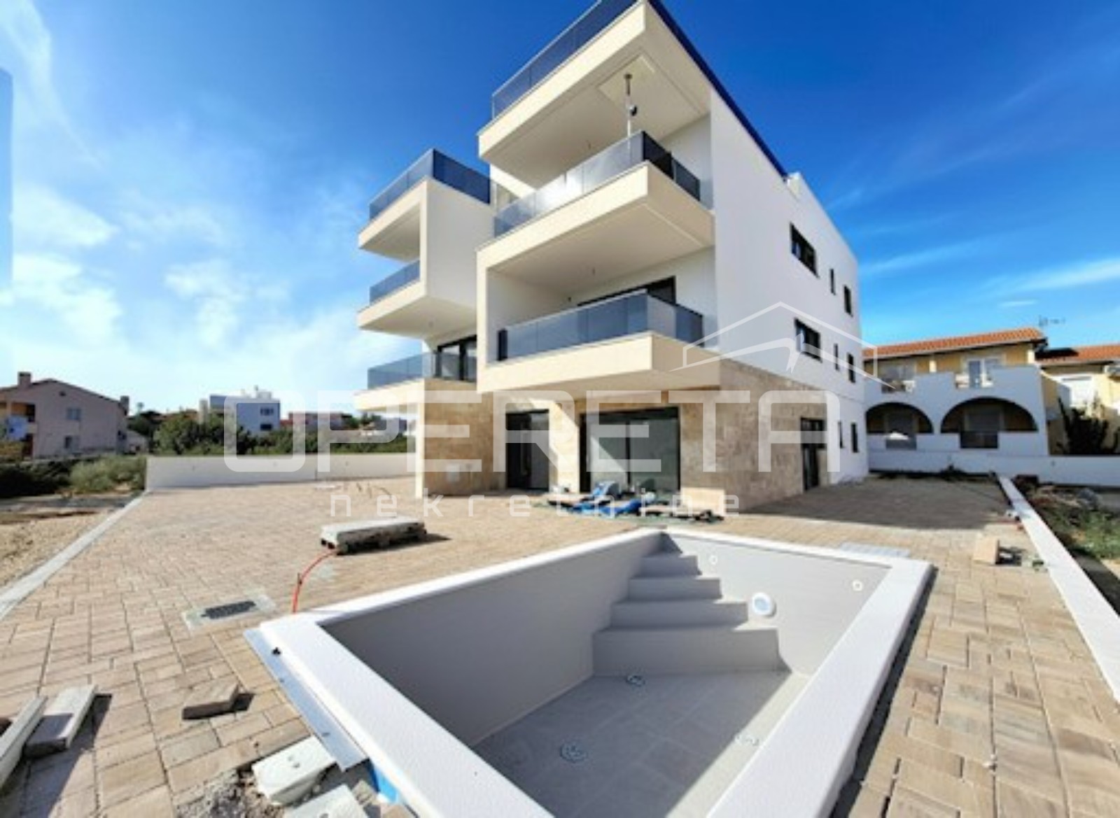 Beschreibung: Privlaka/Zadar – Luxusprojekt 70 m vom Meer, Wohnung A002Nur 70 Meter vom Meer entfernt, im ruhigen Privlaka bei Zadar, entsteht ein nahezu fertiggestelltes Projekt, das bald bezugsfertig ist und den Wohnstandard auf ein völlig neues Niveau hebt. Drei anspruchsvolle Villen – Astoria, Estera und Gina – sind für all jene konzipiert, die mehr als nur eine Immobilie suchen: Sie suchen die perfekte Balance zwischen Luxus, Komfort und Prestige.Die Lage eröffnet ein außergewöhnliches Panorama – das kristallblaue Adriatische Meer, sonnenverwöhnte Inseln in der Nähe und Sonnenuntergänge, die Privlaka zur schönsten Bühne Westdalmatiens machen. Jede Wohnung ist sorgfältig gestaltet, um modernes Design mit zurückhaltender Eleganz zu verbinden, während die großzügigen Terrassen einen privaten Rückzugsort mit atemberaubender Aussicht bieten.Wohnung A002 befindet sich im Erdgeschoss und besteht aus einem Flur, einem Badezimmer, einem Wohnzimmer mit Küche und Essbereich im Open-Space-Konzept, einem ungedeckte Terrasse, zwei geräumigen Schlafzimmern, einem Garten und einem Parkplatz....