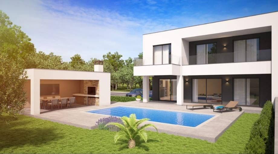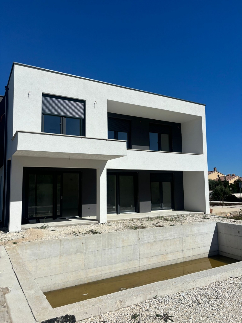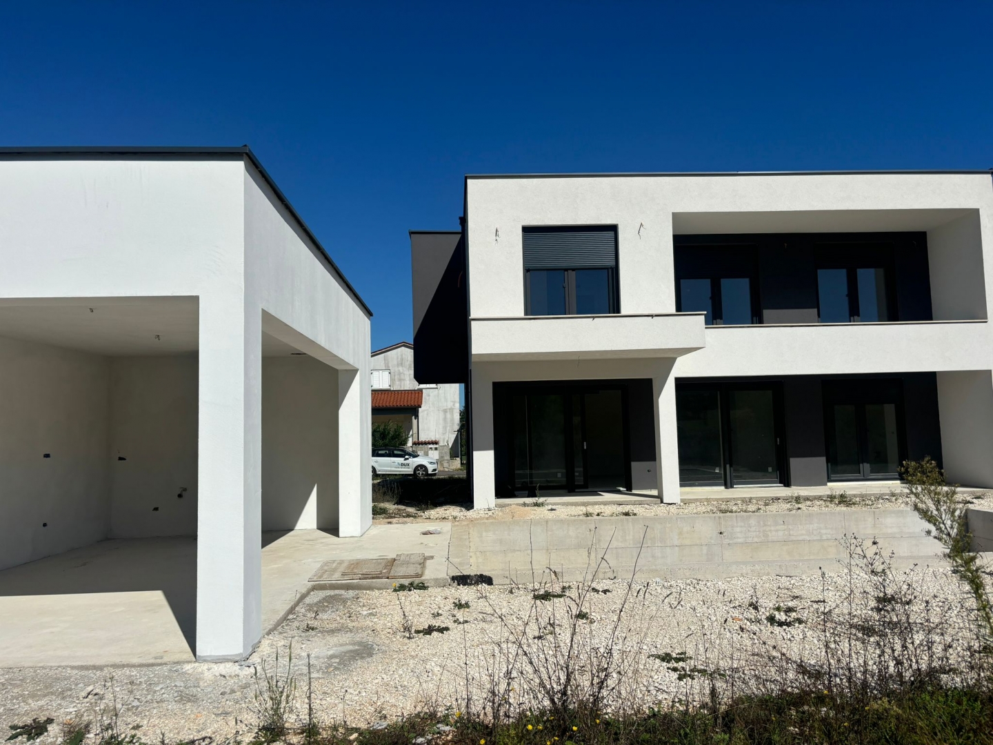 Beschreibung: Hochwertige Doppelvilla mit Pool nahe Labin – Ruhige Lage, modernes Design!Diese neu gebaute Doppelvilla bietet eine perfekte Kombination aus hochwertiger Bauweise, durchdachtem Grundriss und einer ruhigen Lage nur außerhalb von Labin. Sie befindet sich in einer gepflegten Sackgasse, umgeben von neu erbauten Häusern, und bietet Privatsphäre und Komfort, während die nächsten Strände nur 10 Autominuten entfernt und das Zentrum von Labin sowie wichtige Einkaufsmöglichkeiten in 5–7 Minuten erreichbar sind.Die Immobilie hat eine Gesamtfläche von 188 m², davon 155,68 m² Wohnfläche und ein zusätzliches 32 m² großes Nebengebäude. Beim Betreten des Hauses werden Sie von einem Flur und einer Gästetoilette empfangen, die in einen offenen Wohnbereich mit großen Glaswänden führen, die natürliches Licht hereinlassen und direkten Zugang zur überdachten Terrasse bieten. Das Erdgeschoss verfügt über eine moderne Küche mit Essbereich, ein geräumiges Wohnzimmer und zwei Abstellräume – einen integriert in die Küche und einen unter der Treppe....