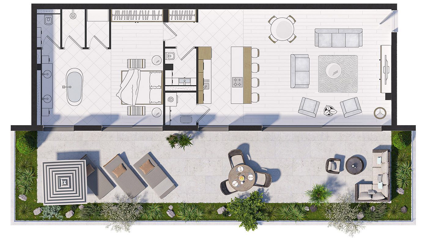 Raspored prostora obuhvata svetao dnevni boravak, jednu spavaću sobu i dva moderna kupatila opremljena kvalitetnim sanitarijama.