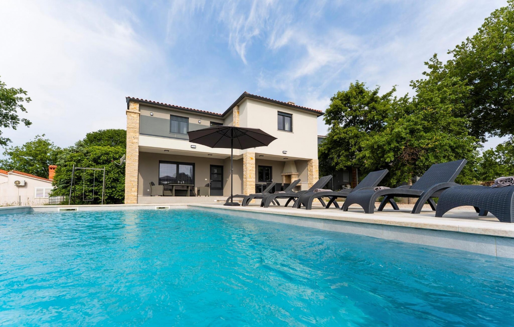 Beschreibung: Ein modernes Haus mit Schwimmbad steht in einem friedlichen Dorf nahe Rabac zum Verkauf, nur 8 km vom Meer entfernt.Das Haus befindet sich an der südöstlichen Küste Istriens, wo üppige grüne Hügel auf die Adria treffen. Die Gegend wird durch die komplementären Städte Labin und Rabac geprägt. Labin, auf einem 320 Meter hohen Hügel gelegen, ist reich an Geschichte und Kultur und verbindet den Charme der alten Welt mit modernem Leben, Kunst und Tourismus. Nur vier Kilometer entfernt bieten die weißen Kiesstrände von Rabac einen perfekten Küstenrückzugsort.Diese Villa, die 148 m² Wohnfläche auf einem 917 m² großen Grundstück bietet, kombiniert zeitlose Architektur mit einem funktionalen und modernen Innenlayout. Das Design trennt die Wohn- und Schlafbereiche für optimalen Komfort. Das Erdgeschoss umfasst den Wohnbereich, einschließlich eines geräumigen Wohnzimmers, Esszimmers und einer offenen Küche mit Zugang zu einer überdachten Terrasse, einem Hauswirtschaftsraum und einer Gästetoilette....