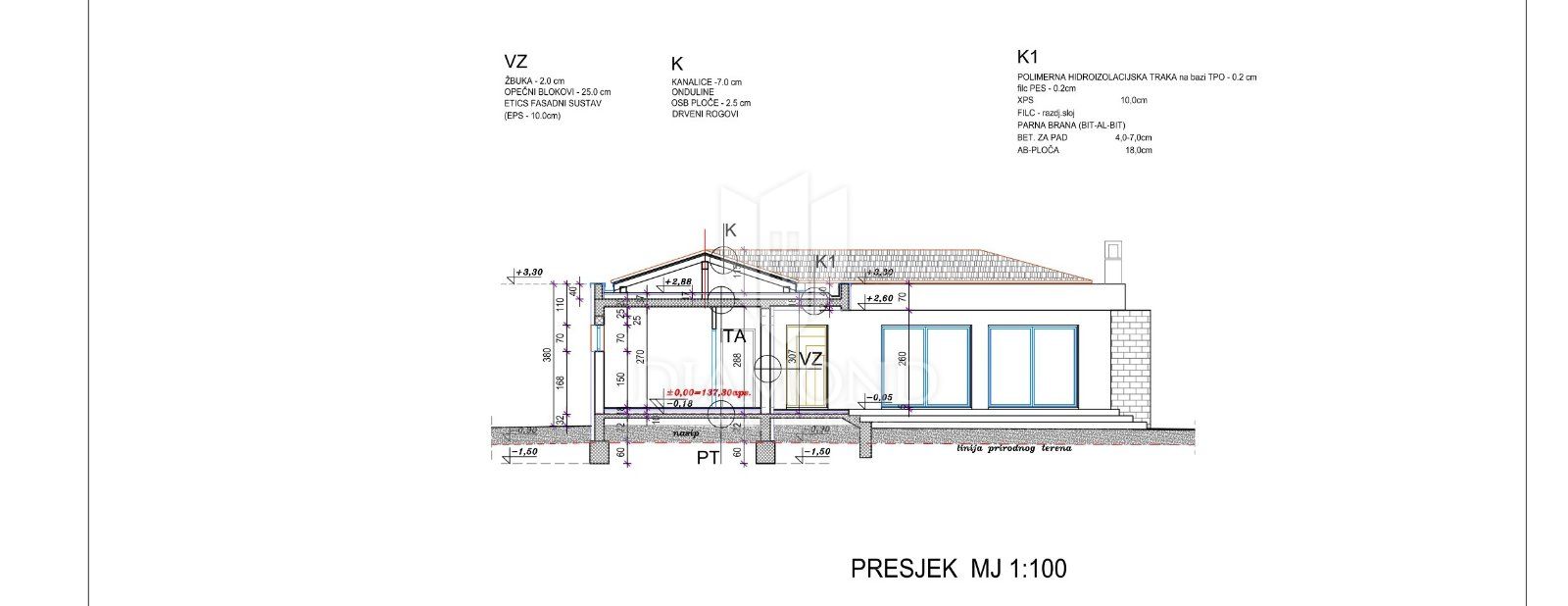 Beschreibung: U blizini Pule, U mirnom i atraktivnom okruženju, idealnom za obiteljski život ili turističko iznajmljivanje, na prodaju je moderna prizemna kuća u RohBau fazi, ukupne stambene površine 117 m², s privatnim bazenom od 35 m².