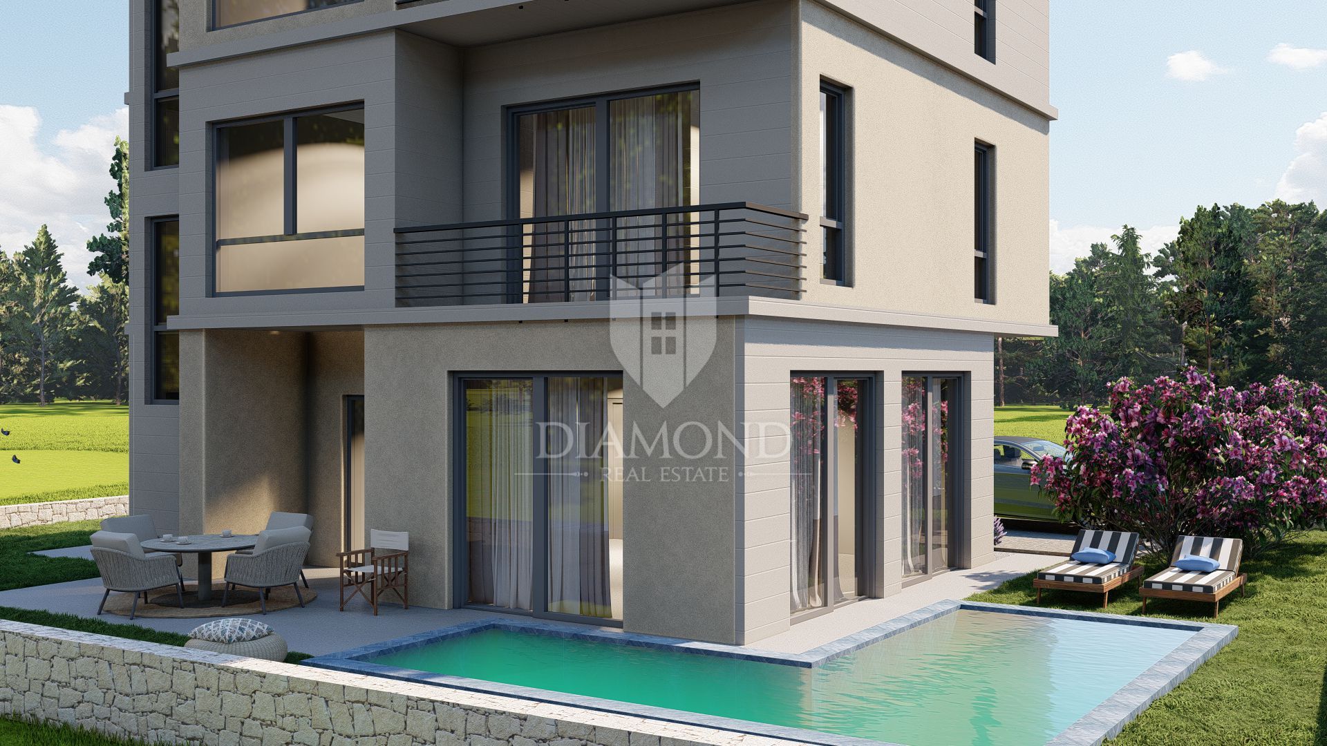 Zgrada se sastoji od samo tri stambene jedinice, što jamči ugodno i tiho okruženje. Gradnja je u tijeku, a planirani završetak radova predviđen je za rujan 2026. godine. Stan se nalazi u prizemlju i ima funkcionalan raspored: sastoji se od hodnika, moderne kupaonice, jedne spavaće sobe te open-space prostora koji povezuje kuhinju, blagovaonicu i dnevni boravak. Iz dnevnog dijela izlazi se na privatno dvorište s bazenom i malim vrtom površine oko 12 m², savršenim za opuštanje i uživanje na otvorenom. Stanu pripada i jedno parkirno mjesto ispred zgrade.