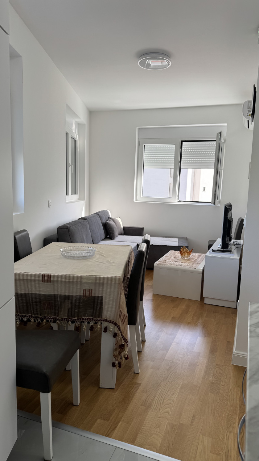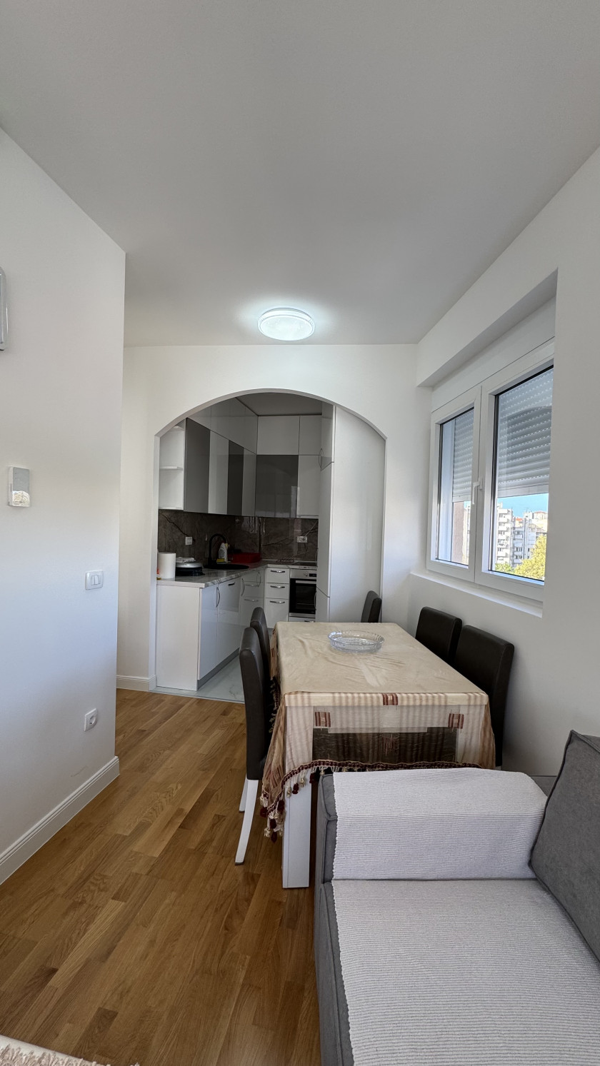 Beschreibung: Stani u potpunosti opremljen, ne useljavam, strukture ulazni hodnik sa plakatima spavaća soba terasa kupatilo i dnevna soba sa kuhinjom trpezarijom. Nalazi se na 8. spratu. Lokacija kod zelene pijace