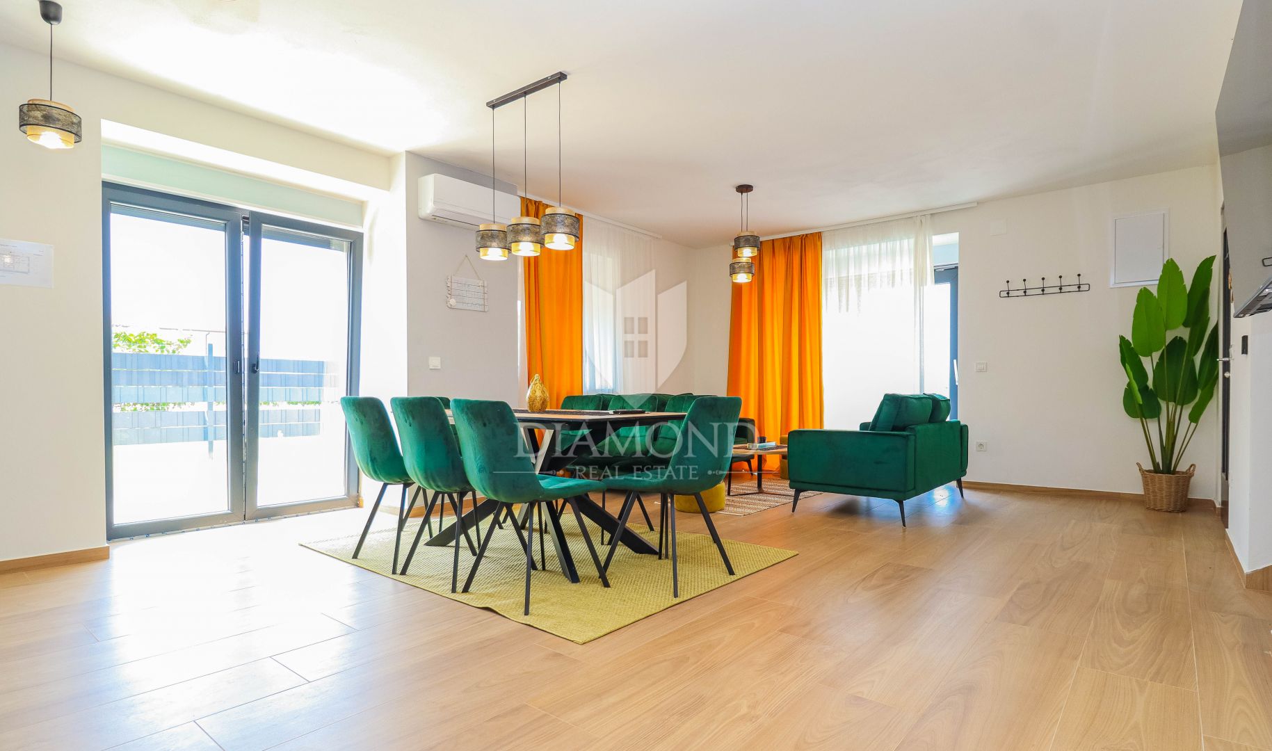 U prizemlju se nalazi prostrani dnevni boravak s blagovaonicom i kuhinjom otvorenog tipa, toalet za goste te praktično spremište. Iz dnevnog boravka izlazi se na lijepo uređenu okućnicu koja pruža dodatni prostor za uživanje na otvorenom. Na prvom katu smještene su dvije spavaće sobe, svaka sa svojom kupaonicom, dok se na drugom katu nalaze još dvije spavaće sobe i dvije kupaonice. Prilikom uređenja kuće posebna pažnja posvećena je detaljima, čime je postignut skladan spoj funkcionalnosti i estetike, uz dozu modernog šarma. U svim kupaonicama, kao i u dnevnom boravku i kuhinji, postavljeno je podno grijanje, dok su spavaće sobe opremljene klima uređajima koji osiguravaju ugodnu temperaturu tijekom cijele godine. Svaka prostorija ima svoj klima uređaj, čime je osigurano efikasno grijanje i hlađenje.