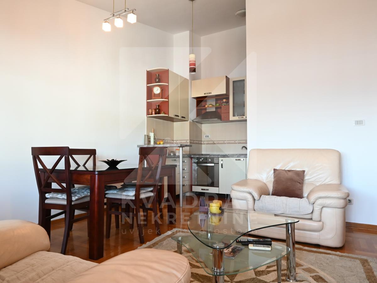 Beschreibung (Englisch): A furnished, one bedroom apartment of 50sqm is FOR RENT, located on the sixth floor of a residential building (not the last), in the Preko Morače neighborhood, in Podgorica.