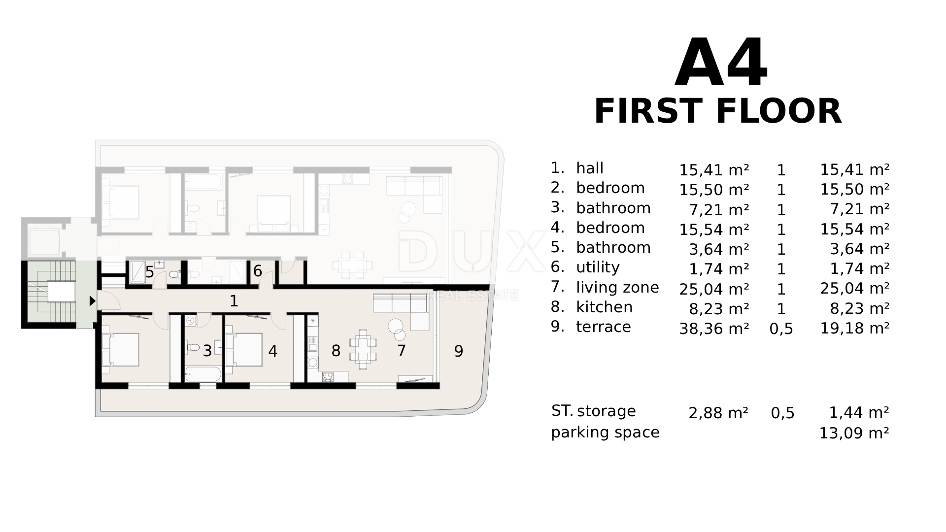 Zum Verkauf steht ein luxuriöses 2-Zimmer-Apartment mit einer großzügigen Terrasse und atemberaubendem Panoramablick auf das Meer und den Yachthafen ACI. Es befindet sich in einer exklusiven Wohnanlage mit Gemeinschaftspool und Tiefgarage. Dieses Apartment bietet die perfekte Kombination aus Privatsphäre und zentraler Lage, nur wenige Gehminuten vom Meer und der prestigeträchtigen Riviera von Opatija entfernt.