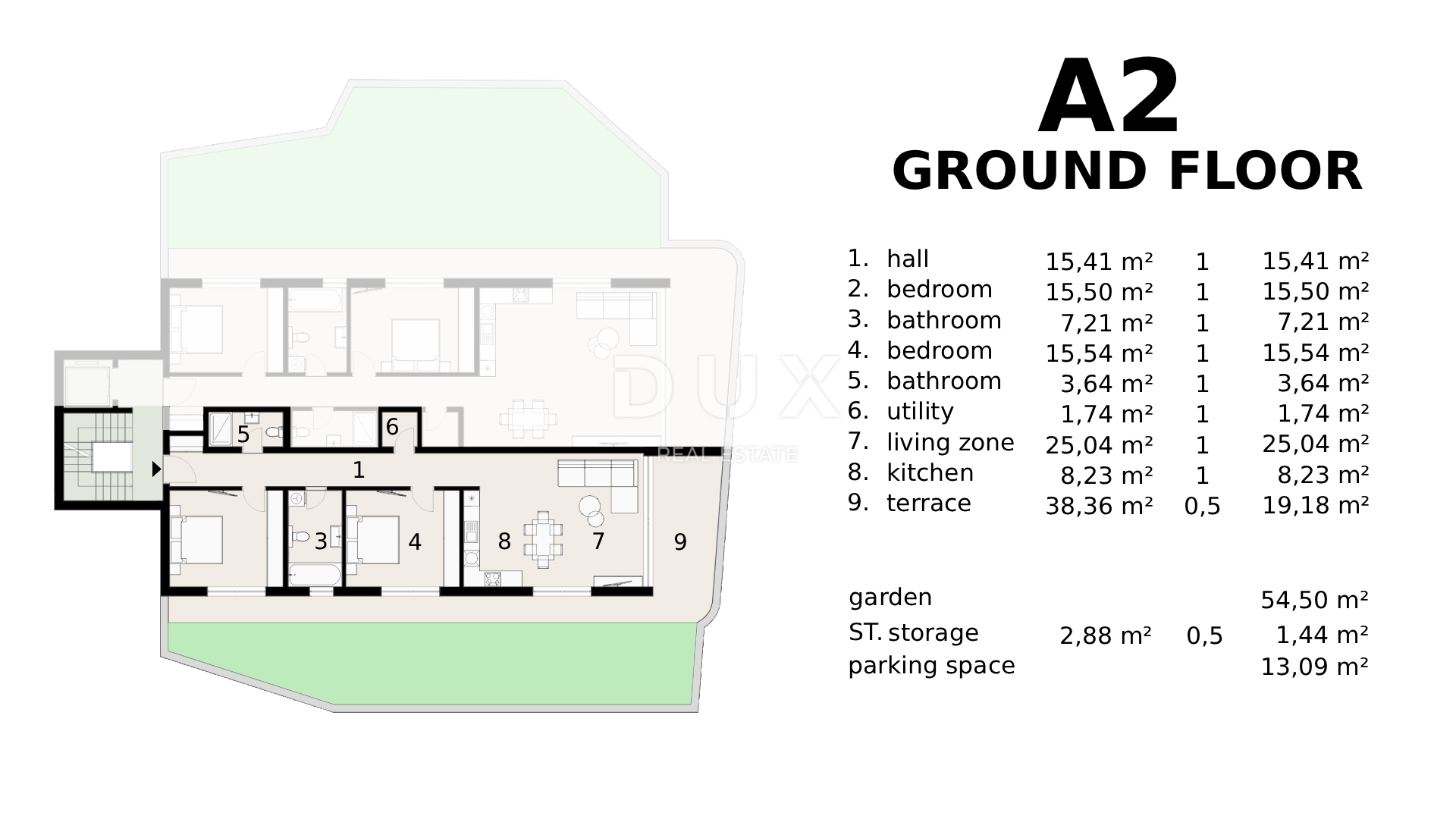 Zum Verkauf steht eine elegante 2-Zimmer-Wohnung mit Wohnzimmer, privatem Garten und atemberaubendem Blick auf das Meer und den Yachthafen ACI. Die Wohnung befindet sich in einer exklusiven Wohnanlage mit Gemeinschaftspool und Tiefgarage in ruhiger Lage, nur wenige Gehminuten vom Meer entfernt.