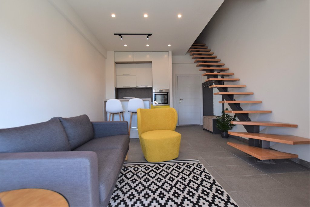 Consists of open plan living room with kitchen and dining area on one level, and bathroom and bedroom on the gallery. There is also a spacious terrace with a great sea view!