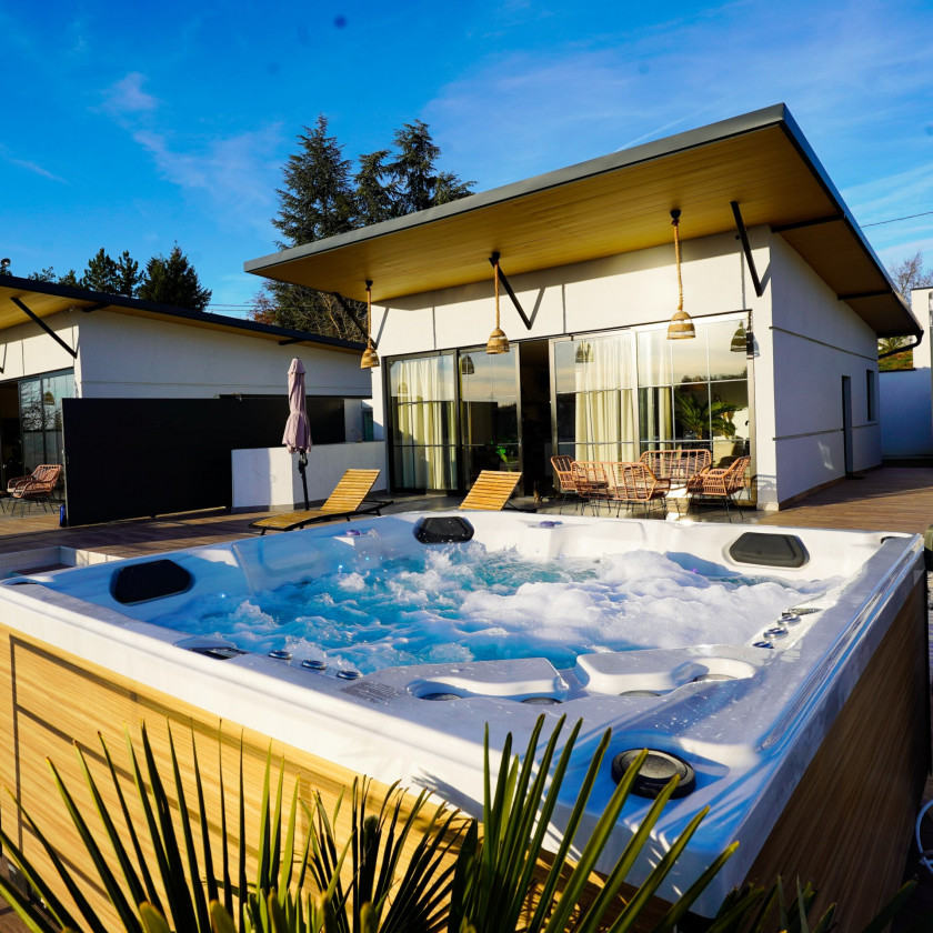Solea Luxury Concept is a trio of three equally luxurious villas with a pool, designed as separate units, each of which is available for rent, as well as renting the entire complex at the same time for events of up to 70 people. Each has a private saltwater pool, with outdoor space and its own part of the yard, while one of the villas also has a jacuzzi that is available until the end of April, after which the pool in which the water is heated can be used. The state-of-the-art deep dive pools with their own heating are surrounded by a lounge plateau made of wooden elements where you can feel like a star with your loved ones on the deck chairs. And in the evening hours, when they appear in the sky, the whole impression is breathtaking. The location of the property is such that it offers an incredible view of the open horizon of greenery that surrounds this landscape and Lake Duboki Potok. From the resort to the lake itself, there is nothing that blocks the view, so your privacy is guaranteed. You don't have to worry if you are undecided with whom you would spend time here - because renting one villa allows up to 20 people to stay, while if you rent the entire complex as already mentioned, that number can go up to 70 guests.