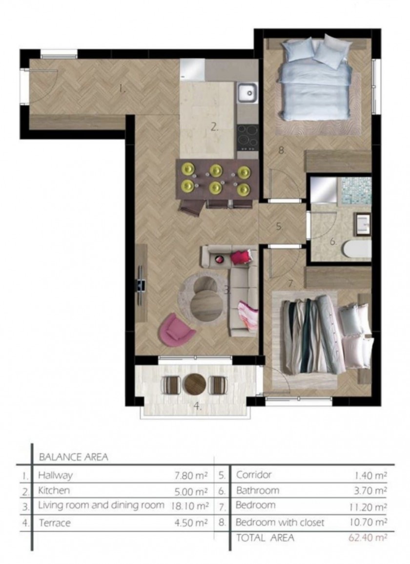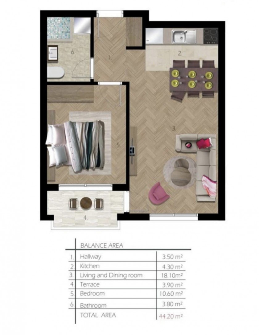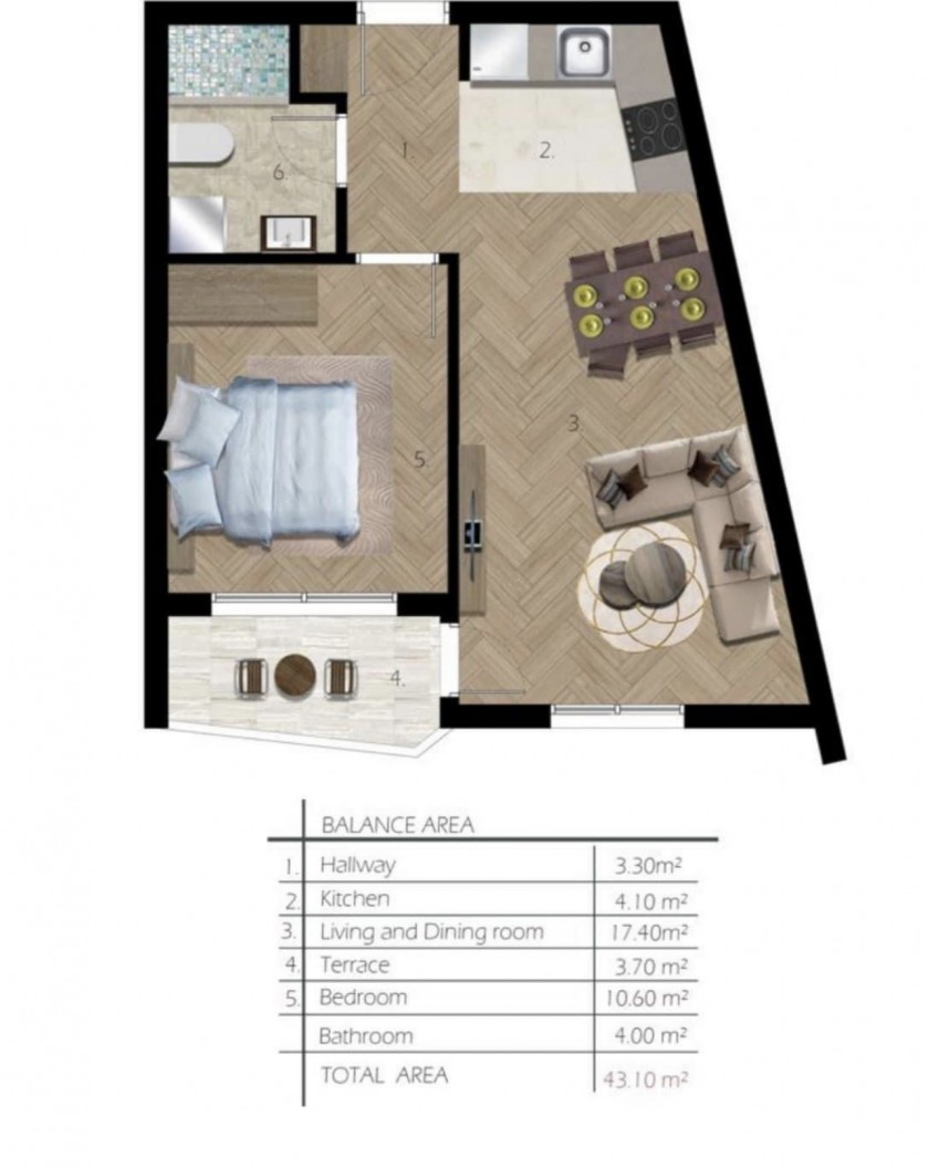 Type: Apartment For Sale District: Ulcinj Location: Pinješ Energy Label: A+ Year Built: 2022 Bedrooms: 1 Baths: 1 Living Area: 43 m2 Parking Spots: 1 From Shore (m): 800 New Construction