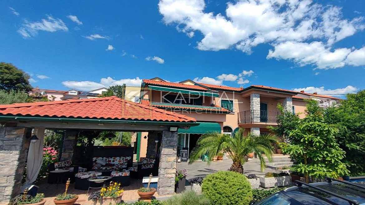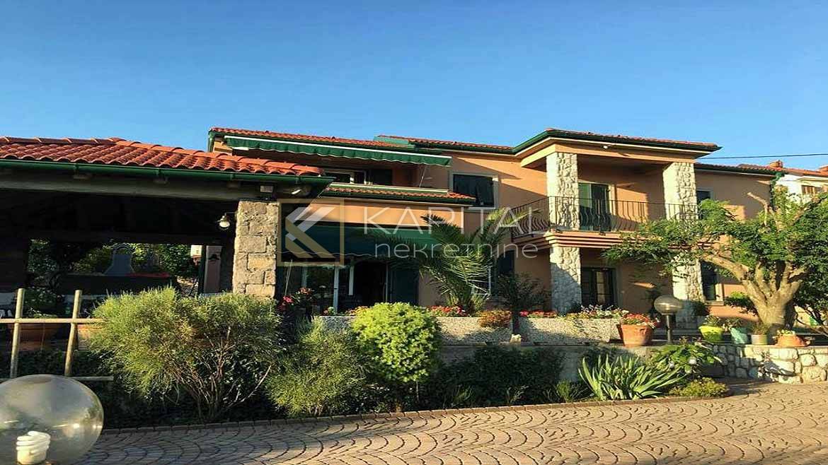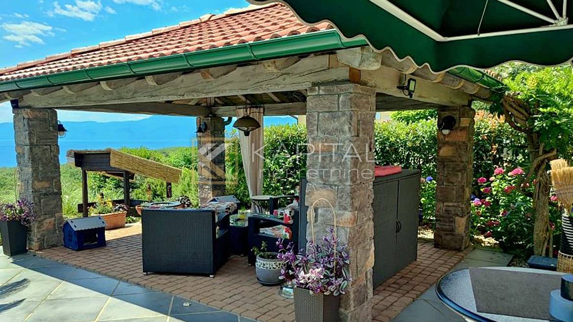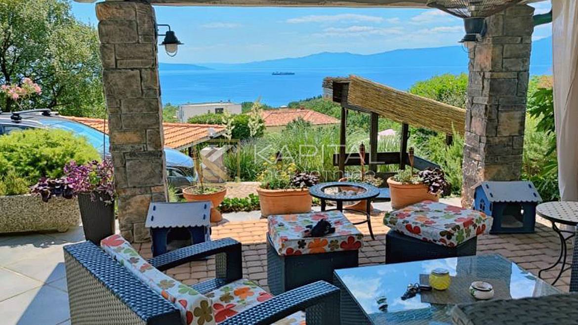 Description: In the immediate vicinity of Svežanj beach, a detached house with two floors, about 20 years old, is for sale. On the ground floor there is a spacious living room with a fireplace and a kitchen with a dining room that leads to an intimate terrace with a beautiful view of the sea. On the ground floor there is also a toilet and stairs leading to the upper floor with three bedrooms (one of which has its own bathroom with a toilet) and one separate bathroom with a sanitary unit. On the upper floor there is another terrace with a panoramic view of Kvarner. The heating system in the house is solved by floor gas heating and air conditioners as well as a fireplace. In the yard there is a nice covered canopy for pleasant gatherings and a swimming pool of 32 m2 and a small commercial building of 33 m2. For any additional information, call 091/540-8520 or 099/219 6353