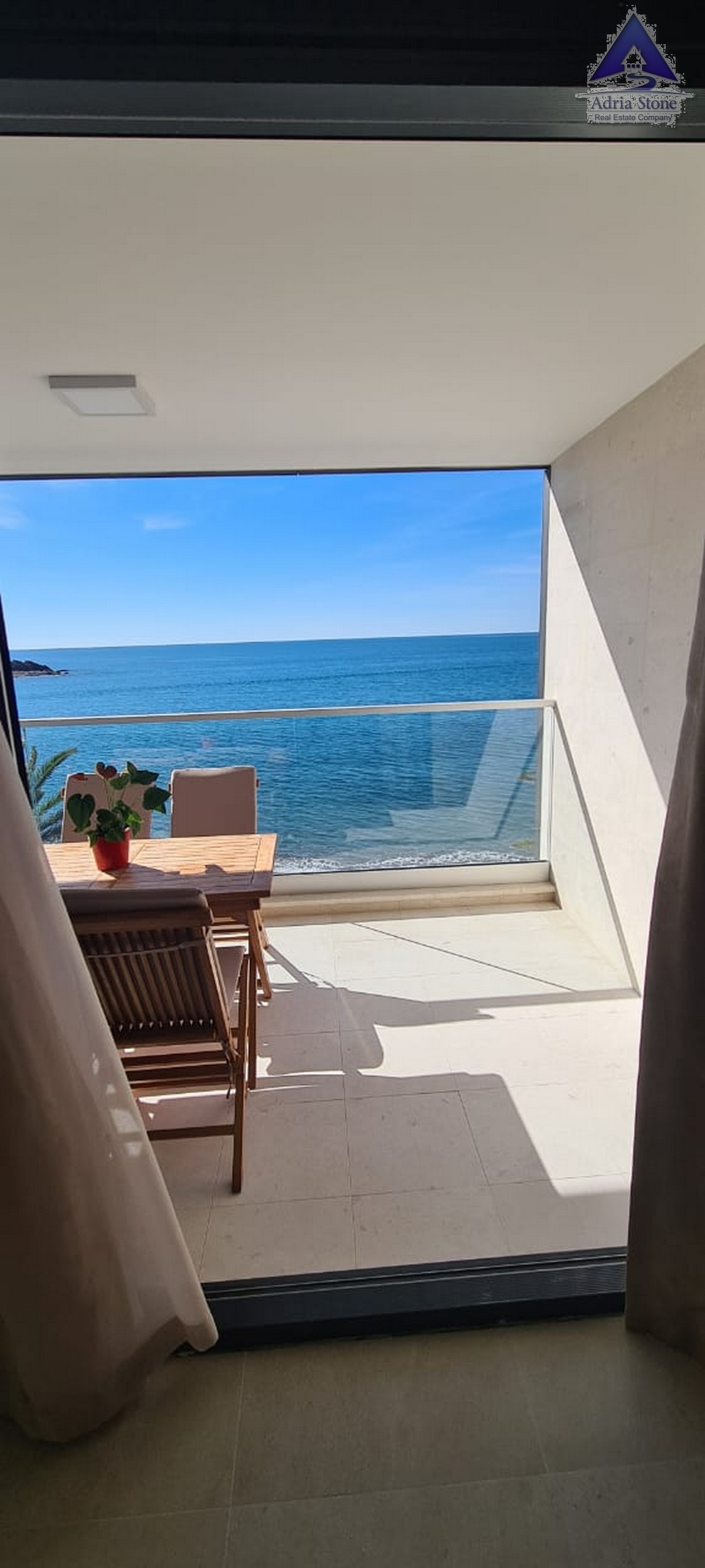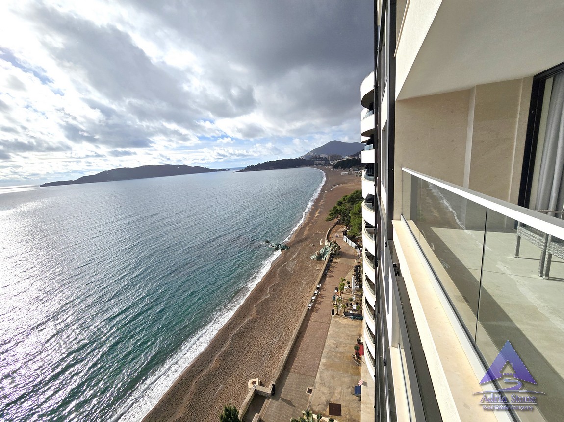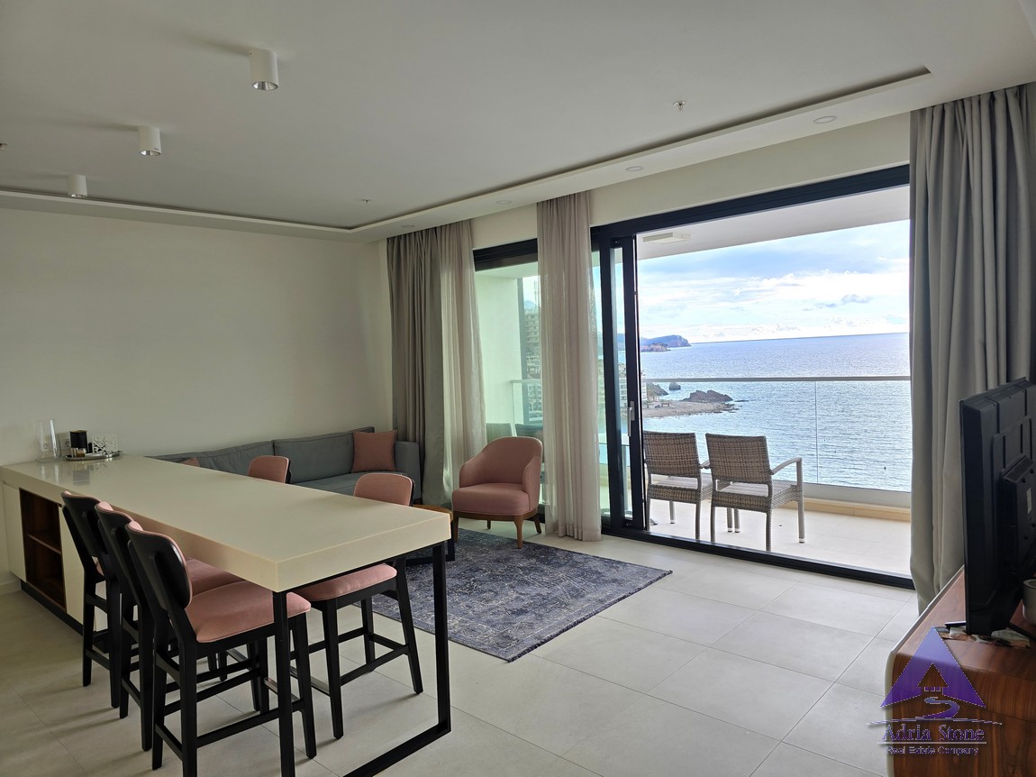 A fantastic two-bedroom apartment is available for sale on the waterfront in Rafailovici, boasting abundant natural light and a stunning panoramic sea view.