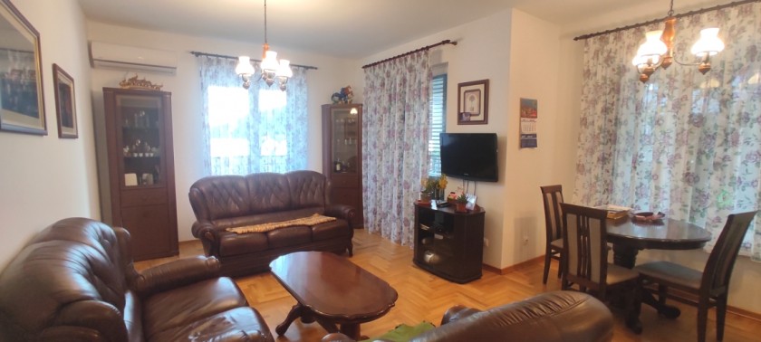 Description: Magnificent apartment of 140 sq. m on the first line in the elite complex Energoproekt in Herceg Novi. A high-quality luxury complex built in 2008 in the most beautiful and prestigious area of Savina. The Old Town is a 10-minute walk. Everything you need for life is nearby: cafes, restaurants, shops, pharmacies, a school, a kindergarten, a wellness complex and a luxurious embankment, 25 kilometers long! The apartment consists of an entrance hall, two bedrooms, two bathrooms, a spacious living room with kitchen area, a large terrace with magnificent panoramic views of the sea and mountains. Sold with furniture, appliances and garage space. There is ample space for a barbecue on the terrace. The apartment is ideal for living all year round, relaxing and renting out!