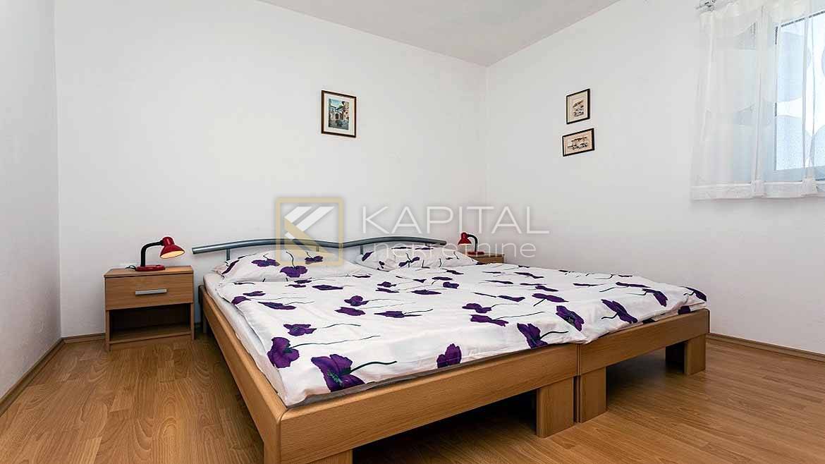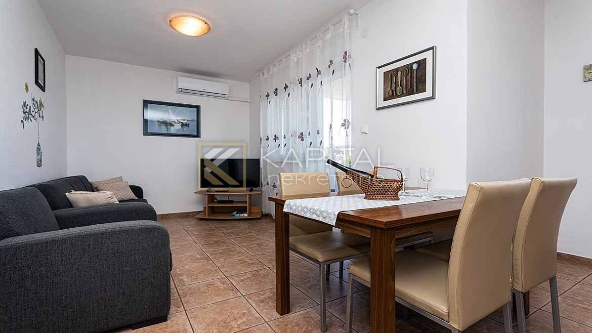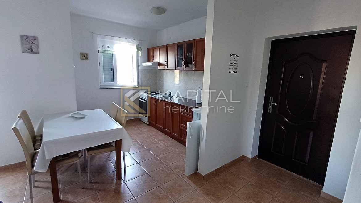 Description: An apartment on the high ground floor with a storage room in the basement is for sale, with a total area of 107 m2. It consists of: living room with kitchen and dining room, three bedrooms, bathroom, toilet and balcony. Apartment has two parking spaces. Furniture is sold in the price. Neat building of 6 apartments, neat documentation. It is 400 m from the sea and a sandy beach. Shops and bus stops are 50 m away. For all information, call 385 91/5406-611