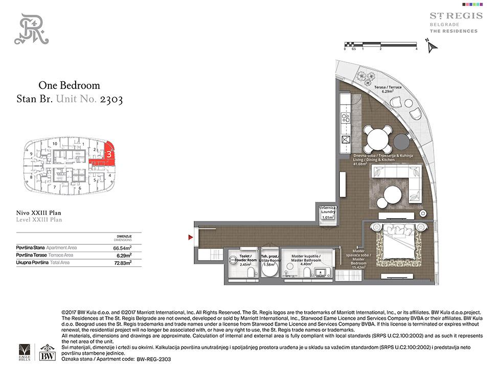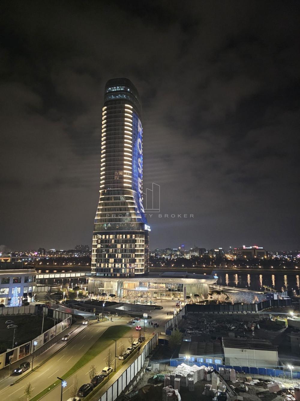 Description (Croatian): Prodajemo unikatan stan u Kuli St. Regis na prestižnoj lokaciji u kompleksu Beograd na vodi. Stan se nalazi na 23. spratu, sa spektakularnim pogledom, koji se sastoji od ulaznog hodnika koji vodi u prostran dnevni boravak sa kuhinjom i trpezarijom, jednom spavaćom sobom, kupatila, toaleta i vešernice.