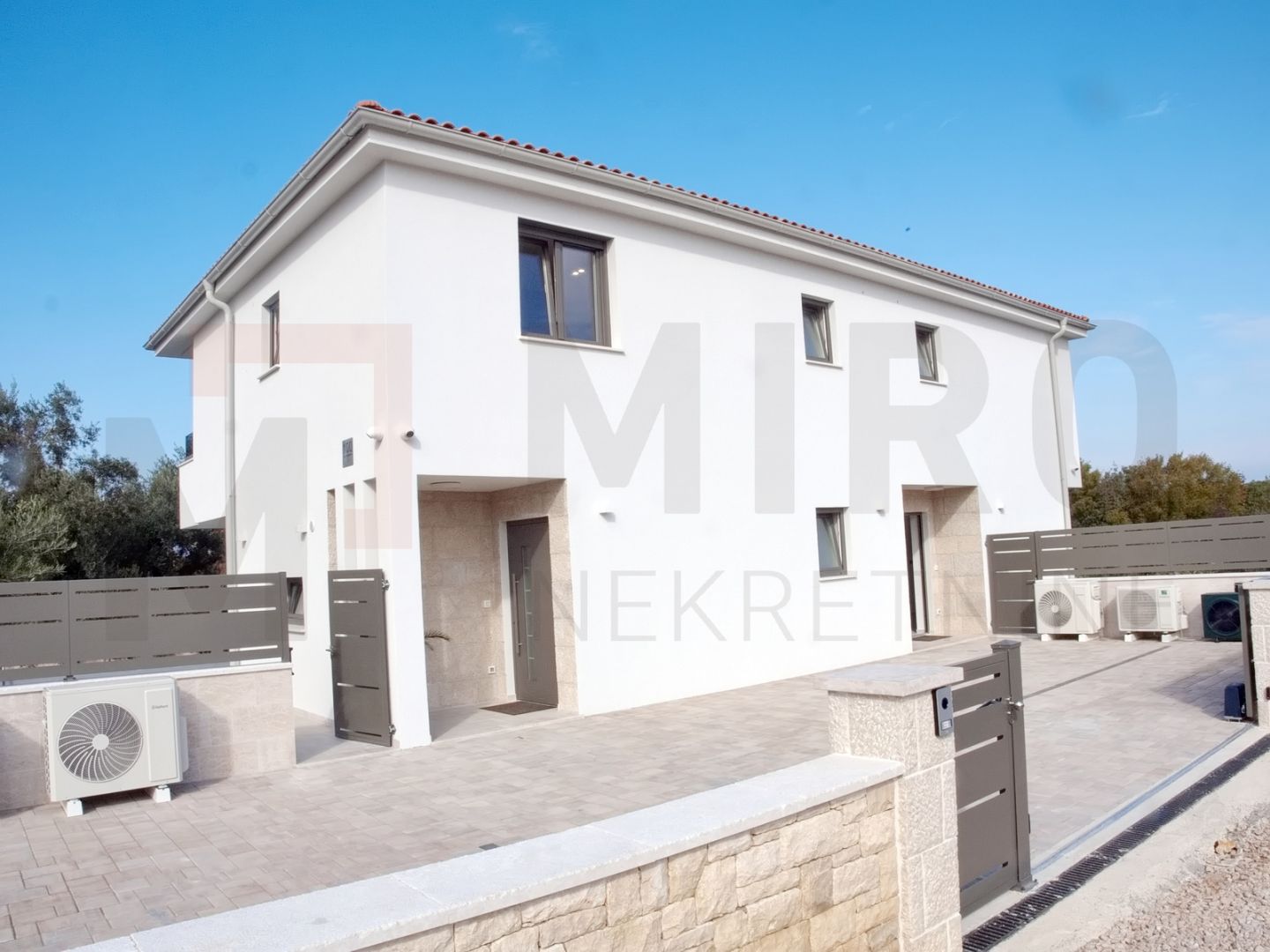Description (Croatian): Otok Krk, Malinska, prodaje se moderano namještena dvojna kuća s privatnim bazenom, smještena u mirnom dijelu okolice Malinske, nedaleko od mora. Nova dvojna kuća ukupne stambene površine od 109 m2. Prizemlje se sastoji od natkrivenog ulaza koji vodi u prostrani hodnik, a tu su i gostinjski WC te ostava. Središnji dio prizemlja čini otvoreni prostor u kojem se nalaze kuhinja, blagovaonica i dnevni boravak s izlazom na natkrivenu terasu. S terase se ide prema bazenu i sunčalištu. Unutarnje stepenice vode na prvi kat, gdje su smještene tri spavaće sobe. Master spavaća soba ima vlastitu kupaonicu i izlaz na natkrivenu terasu. Kvalitetna gradnja i oprema: podno grijanje (Vaillant dizalica topline), klima uređaji (Toshiba), električne rolete, grijani bazen s elektrolizom. Dva parkirna mjesta. Završetak gradnje planiran je za kraj 2025. Nekretnina je u sustavu PDV-a i kupac ne plaća porez na promet nekretnina. Prodavatelj jamči čistu vlasničku dokumentaciju zemljišta. Posjetite nas i pronađite kvadrat vašeg doma!