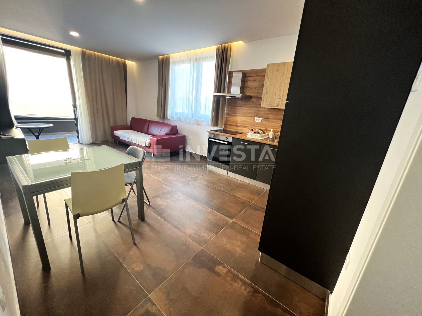 Description: The apartment is located on the first floor of a residential building in the attractive district of Medulin, just 100 meters from the sea and beautiful beaches.