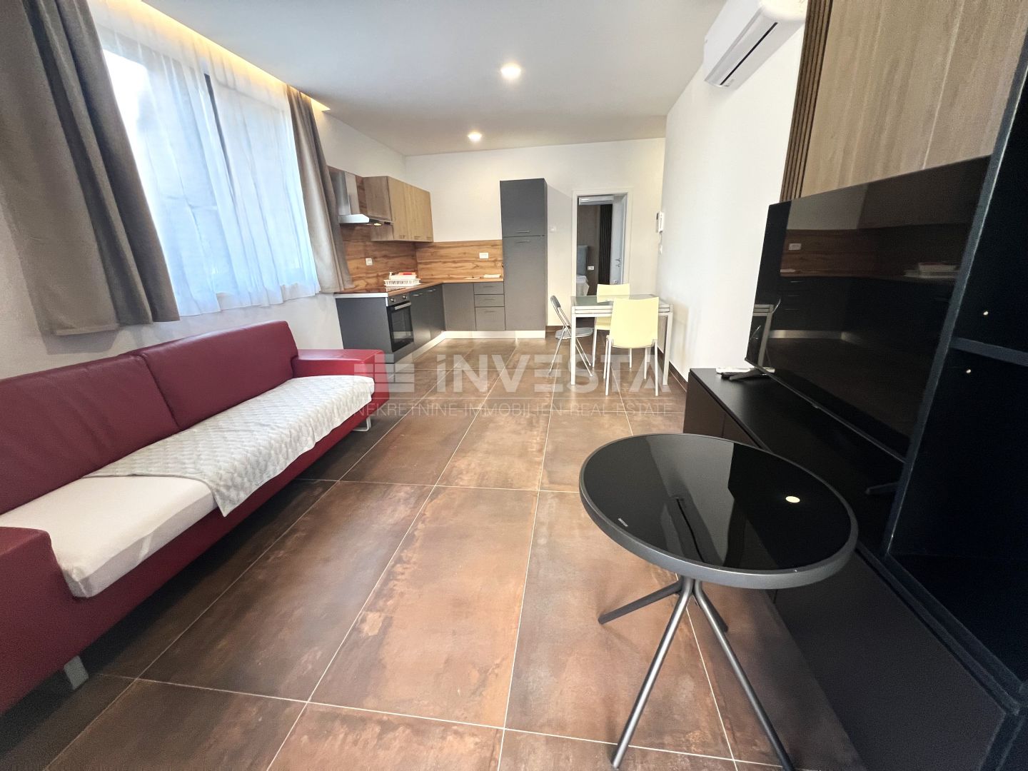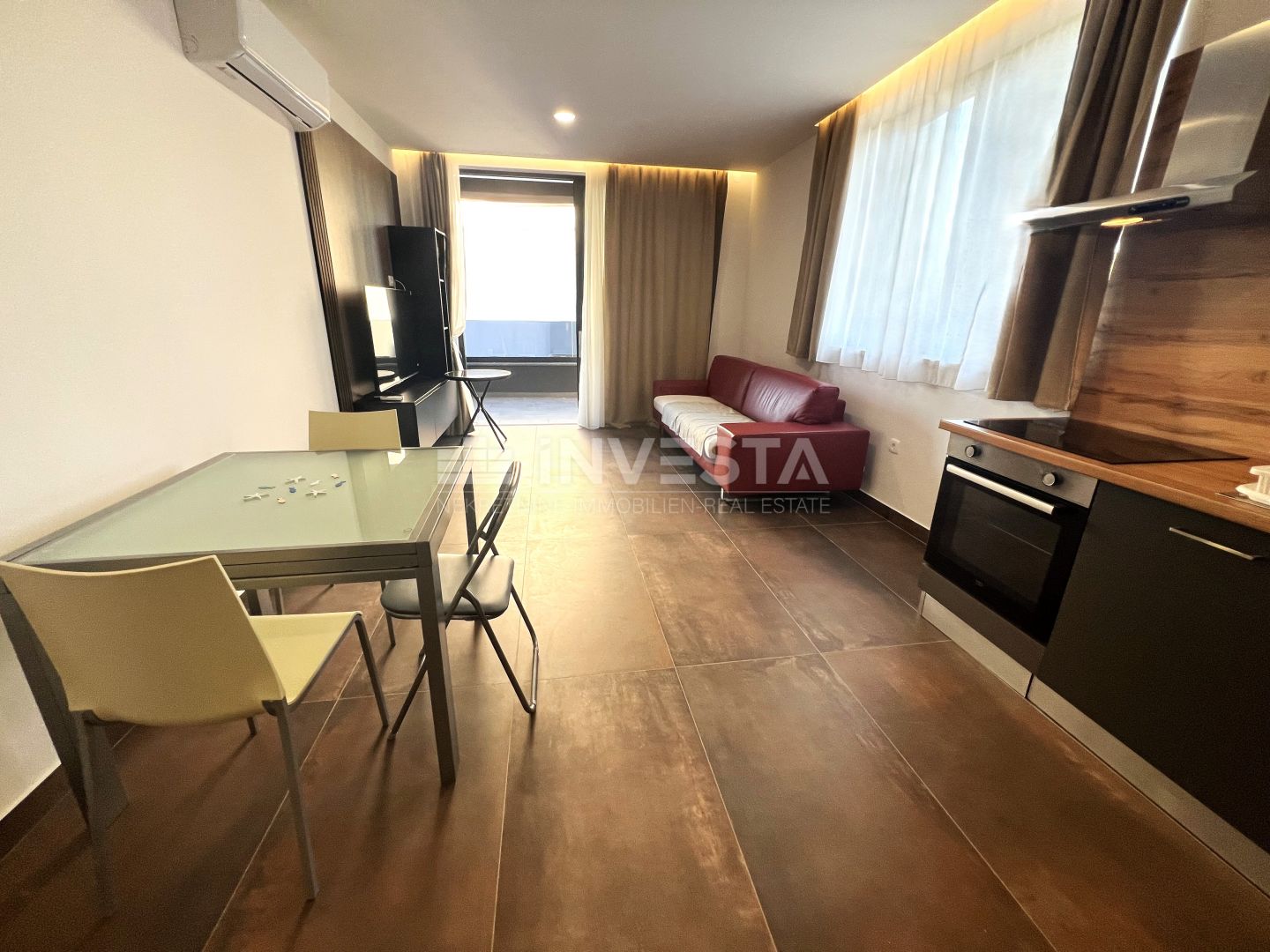 The total area of the apartment is 54 m² and consists of an entrance hallway, bathroom, one bedroom, and an open-plan living area with kitchen and dining room, leading to a spacious terrace. The apartment includes an outdoor parking space. It is modernly furnished with a stylish kitchen. The bathroom is equipped with a walk-in shower and underfloor heating. Heating and cooling are provided by air conditioning in all rooms, with additional underfloor heating in the bathroom.