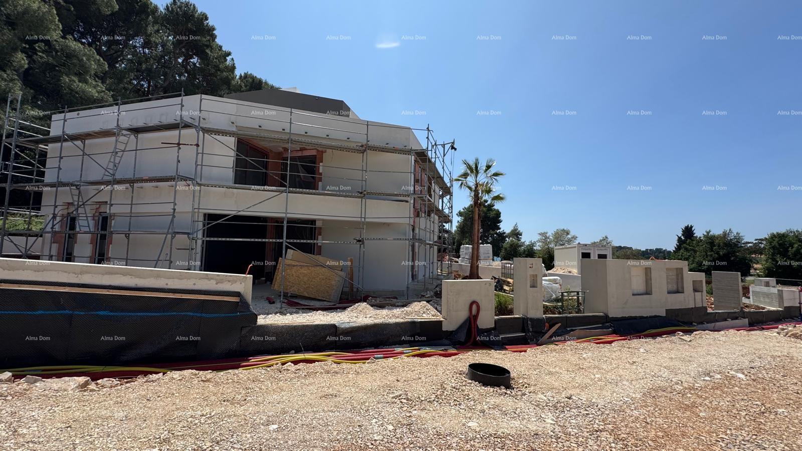 Description: Modern villa for sale in Rovinj. Villa with elevator, surface area 316 m2, consists of ground floor, first floor and attic. It is located on a plot of 1180 m2 and consists of a spacious living room, which is connected to a large covered terrace, a luxurious Poliform kitchen equipped with high-end appliances, three bedrooms with private bathrooms, wardrobes and covered terraces. Roof terrace with jacuzzi, sauna, emotional shower, bar, toilet and green garden. Covered terraces - 164 m². Open terraces - 105 m².