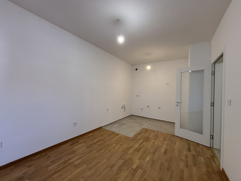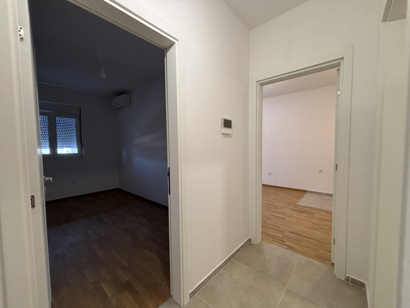 Two bedroom apartment for sale in a new building at Stari Aerodrom, Podgorica. The apartment is located on the fifth floor and is oriented to the east with a view of the boulevard. The apartment is 66 square meters and has two bedrooms, toilet, hallway, bathroom, living room with dining room, kitchen and terrace. The apartment is equipped with the highest quality carpentry, German sanitary ware and has a split system air conditioner with 3 indoor units. The building has two elevators, a large parking lot around the building with a children's park in the inner atrium. The price of the apartment includes a parking space of 13 square meters at a price of 15,000 euros.