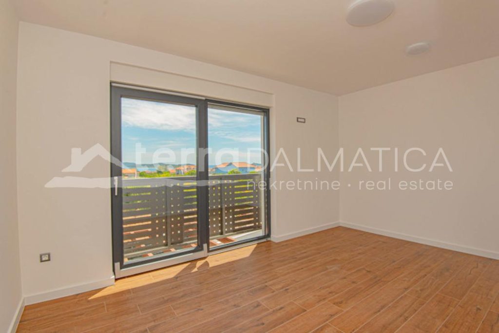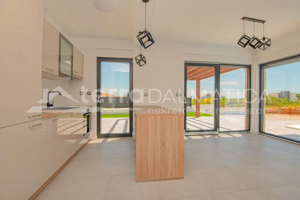 Description: A modern semi-detached house with a swimming pool is for sale in Vodice. The house is part of a building located on the outskirts of Vodice, on a hill, so the roof terrace offers an enchanting view of the sea. The house consists of ground floor, first floor and roof terrace. On the ground floor there is a open space living area with kitchen, dining room and living room, entrance hall, storage room and toilet. The living room opens onto a terrace and a beautifully landscaped yard with a swimming pool. An internal staircase leads to the first floor where there is a hallway, the bathroom and a three bedrooms, one of which has its own bathroom. Auxiliary stairs from the first floor lead to the roof terrace. High quality materials and equipment were used in the construction of the house. The kitchen is fully equipped. Underfloor heating is installed in all bathrooms, and air conditioning in the living area and bedrooms. Video surveillance is installed, as well as security doors with entrance control. An electrically powered awning is set up on the terrace. Vodice is a beautiful Dalmatian town and one of the most popular tourist destinations on the Adriatic....