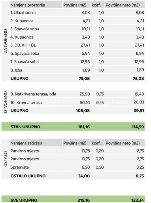 Description: A comfortable three bedroom apartment with a roof terrace in a residential building with nine apartments is for sale in Zadar. It is located in a great location, in a quiet neighborhood not far from the Visnjik Sports Center. The apartment consists of a closed and an open part. The closed part consists of a hallway, three bedrooms, two bathrooms, kitchen, dining room, living room and storage room. The open part consists of a covered terrace and a loggia. There is underfloor heating throughout the entire apartment, air conditioners and PVC joinery with electric blinds are installed in all rooms. The apartment is located on the second floor of the building, and it has its own furnished roof terrace with a view of the city. The apartment also has a storage room in the basement and two parking spaces. The property is a great opportunity for a large family looking for several residential units for a pleasant and comfortable life, but also for tourist rental. The building is under construction, and the planned move-in date is in the fall of 2023. The property is located in a quiet part of Zadar, ideal for enjoyment and rest. It is only 3 kilometers away from the old city center....