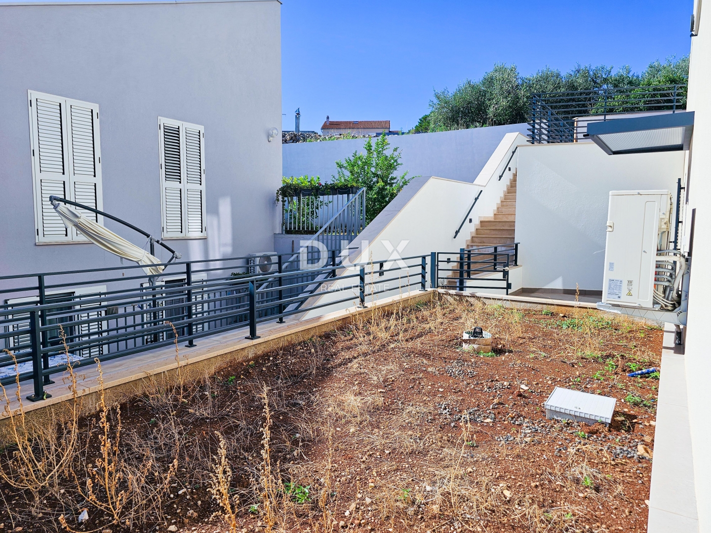 Rarity on offer! We present a new apartment in the very center of Mali Lošinj. The apartment is located on the ground floor of a small residential building, a few minutes walk from the main square, and will delight you with its floor plan and garden that is waiting to be decorated! The living area is 47.21 m2, and the apartment also has a 30 m2 yard, a parking space in the garage and a storage room. Excellently designed floor plan - at the entrance to the apartment there is an open entrance hall and a bathroom. The front part of the apartment contains a kitchen, dining room and living room, with access to a loggia. Behind is a bedroom, of a nice irregular shape. The building was built with quality materials, underfloor heating in the bathrooms, modern joinery with triple-layered glass, electronic roller shutters, multi-split air conditioners, burglar and fire doors, intercom. The floor coverings are high-quality ceramics and top-quality parquet, and on the outside there are anti-slip ceramics and stone. The apartments are ready to move in. The documentation is in order....