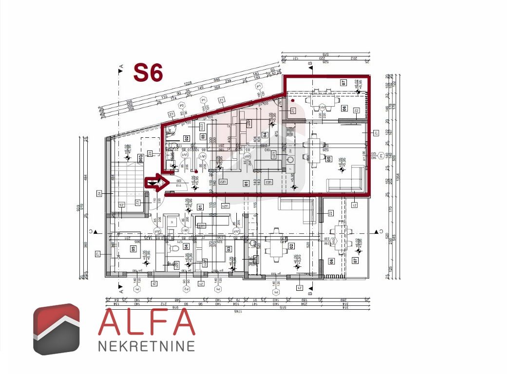 Apartment S6 consists of an entrance hall, two bedrooms, one bathroom, a kitchen with dining area and living room, and a spacious inviting terrace.