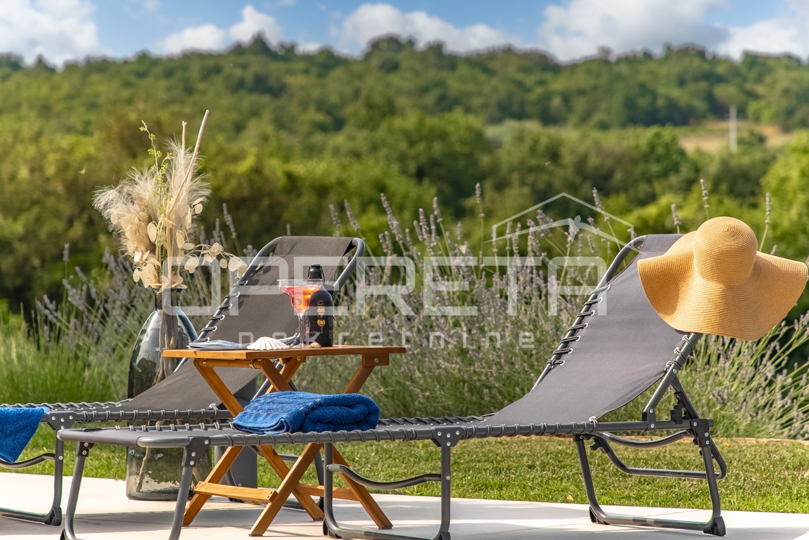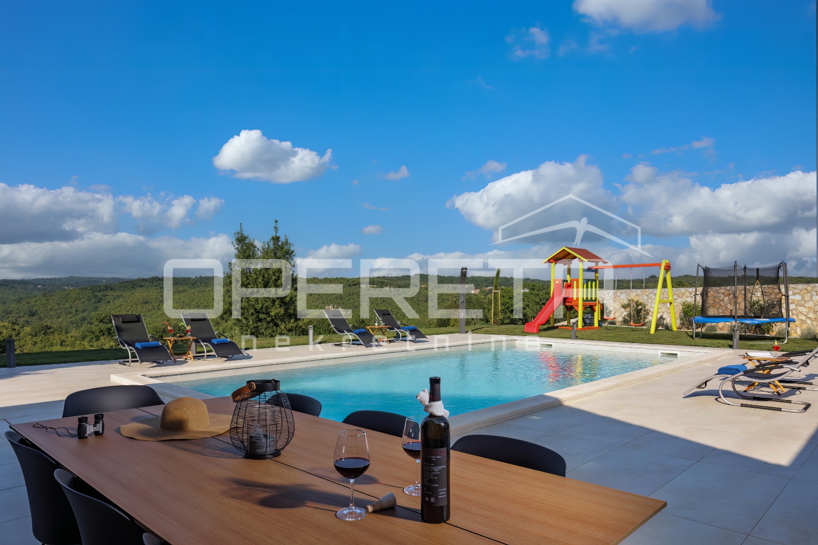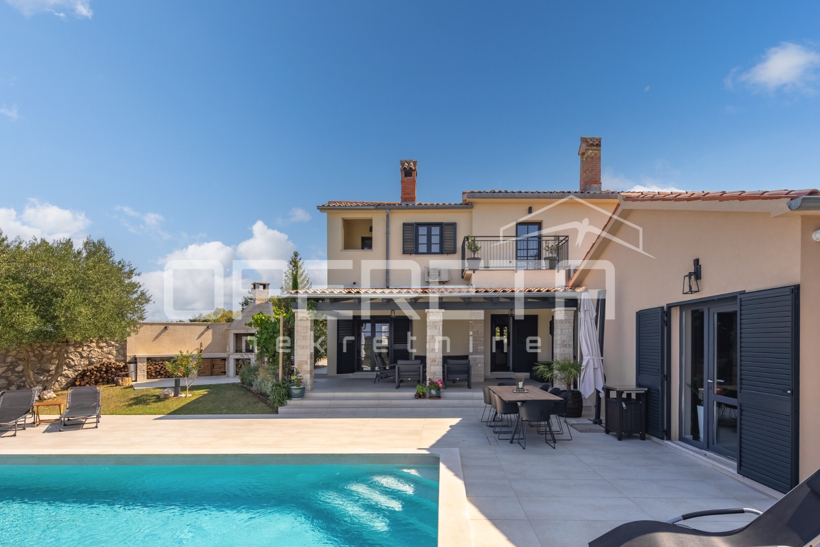 Description: In the heart of the peaceful Mediterranean landscape, with a beautiful panoramic view of the Učka Nature Park, lies this beautiful villa, a combination of authentic Istrian charm and modern luxury.Surrounded by greenery and complete privacy, this villa provides the perfect retreat for relaxation and enjoyment.The net area is 273 m2, and the spacious land of 2459 m2 is divided into a building and agricultural part.The interior is designed with an emphasis on comfort and elegance. Four spacious bedrooms have their own bathrooms decorated with Italian ceramics, while the living area is adorned with an authentic stone fireplace that gives the space a special character. The modern custom-made kitchen is connected to the dining room and bar, creating the perfect place for socializing, while all spaces are carefully connected to outdoor terraces to emphasize the harmony of indoor and outdoor life.The exterior of the villa is equally impressive....