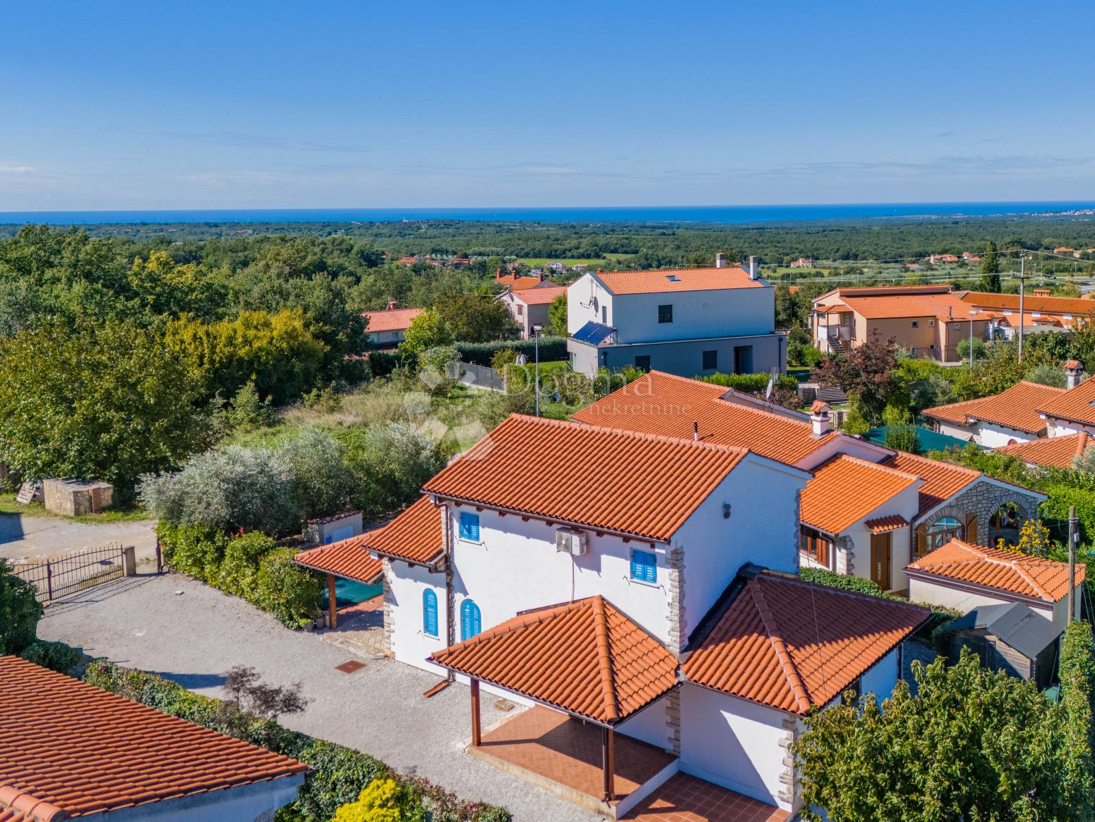 U mirnom mjestu nedaleko od Poreča, na prodaju je šarmantna kuća koja spaja tradicionalni stil s modernom funkcionalnošću. Kuća ukupne površine 150 m² smještena je na lijepo uređenoj okućnici od 550 m², gdje su smješteni bazen s popločenim sunčalištem i ugradbeni roštilj – savršeno za opuštanje i druženja na otvorenom.