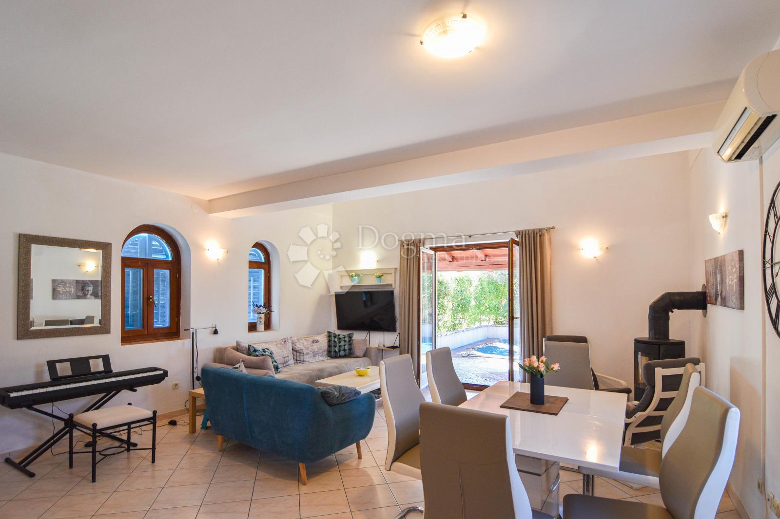 Nekretnina se prostire na dvije etaže – prizemlje i potkrovlje. U prizemlju se nalazi prostran dnevni boravak s kuhinjom i blagovaonicom iz kojeg se izlazi na ugodnu natkrivenu terasu. Kuća raspolaže s ukupno tri spavaće sobe i dvije kupaonice, što je čini idealnom za obitelj ili veći broj gostiju.