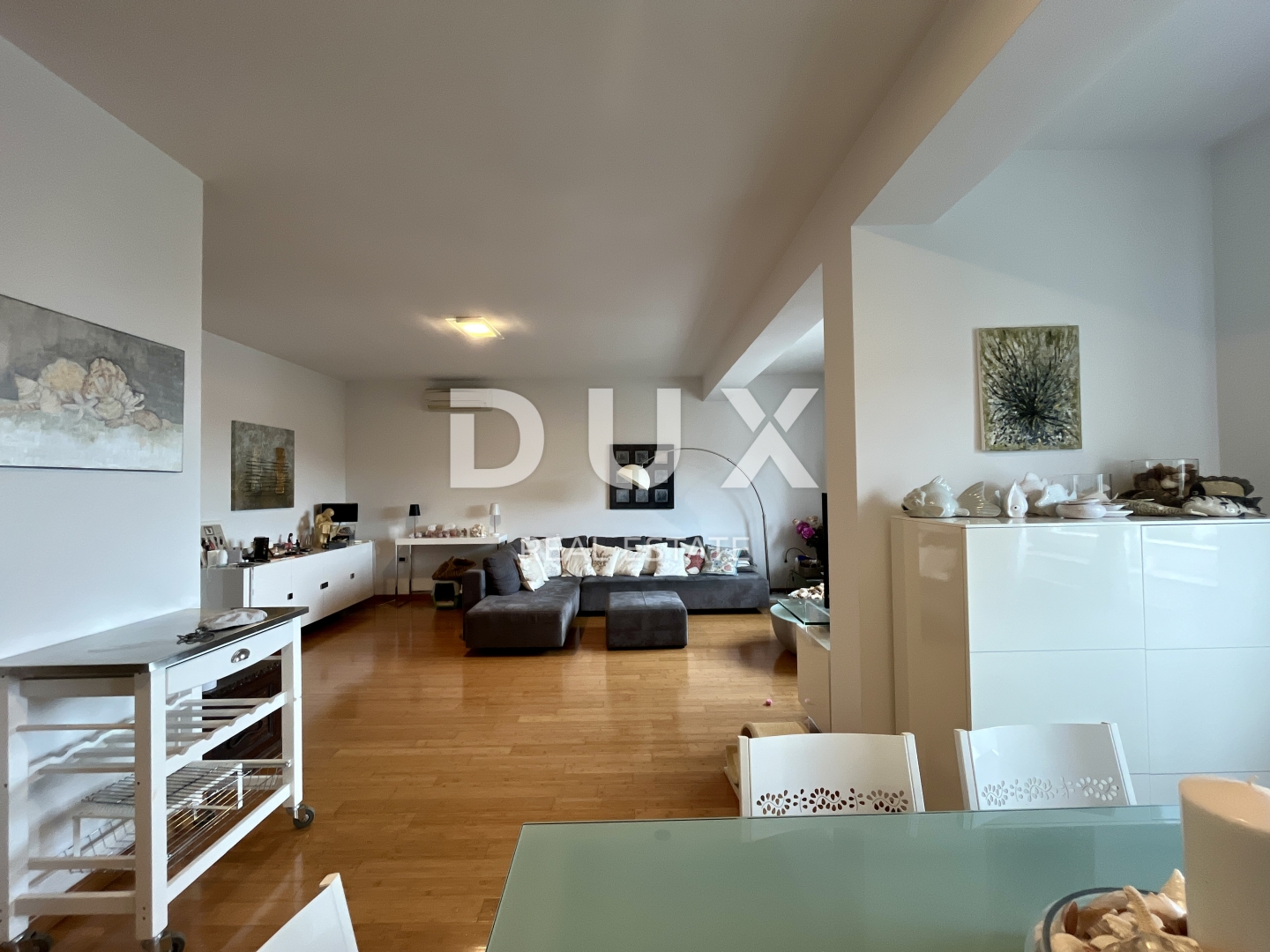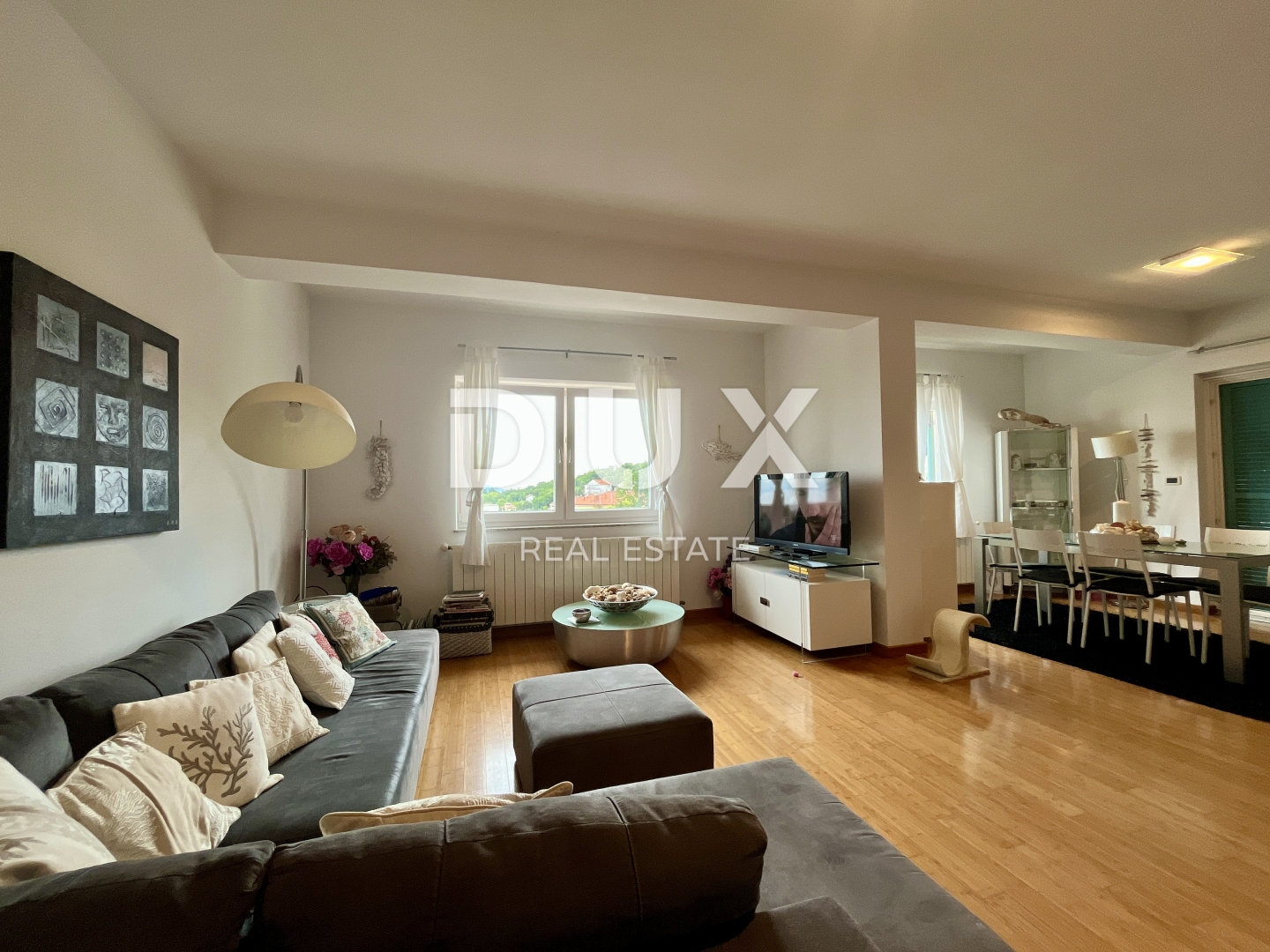 In a quiet location, only 300 meters from the sea, this extremely pleasant apartment with two bedrooms is located in a smaller, newer, high-quality building with only 7 apartments. It takes less than 5 minutes to walk to the beach and the promenade. Although it is located on the high ground floor, due to the configuration of the terrain and the garage space below, the apartment is completely at the height of the first floor, which provides it with additional privacy and a view of the sea. Layout: open-space living room with kitchen and dining room, two bedrooms, bathroom, hallway and entrance hall, spacious terrace of approx. 35 m² with a beautiful view of the sea and the Kvarner Bay. The special value of this property is the terrace - a real private oasis, covered by a movable awning and ennobled by greenery, which provides an intimate and relaxing ambience. Additional features: oil central heating, air conditioning for cooling, quality construction and a prime location. The apartment comes with one parking space within the garden for use, as well as a 2....