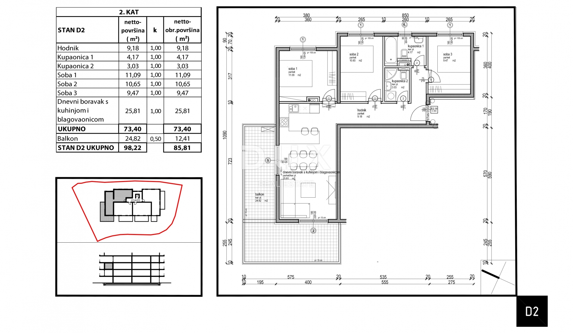 In the quiet village of Tara, just 350m from the sea and a ten-minute walk to the well-maintained beaches, there is a modern, top-quality new building with a total of 13 apartments. This unique apartment is located on the second floor of the building, which covers 85.81 m² of living space and represents a combination of luxury, comfort and a superb view. APARTMENT DESCRIPTION Apartment D2 covers a net area of 85.81 m². The layout of the rooms is designed to maximize spaciousness and natural light: * Entrance hall with a designated area for a wardrobe * Open space living room – a modernly designed space that combines the living room, kitchen and dining room into one. * Spacious terrace – which extends next to the kitchen and dining room, ideal for socializing and relaxing with friends and family. * Then there are three comfortable bedrooms and two bathrooms....