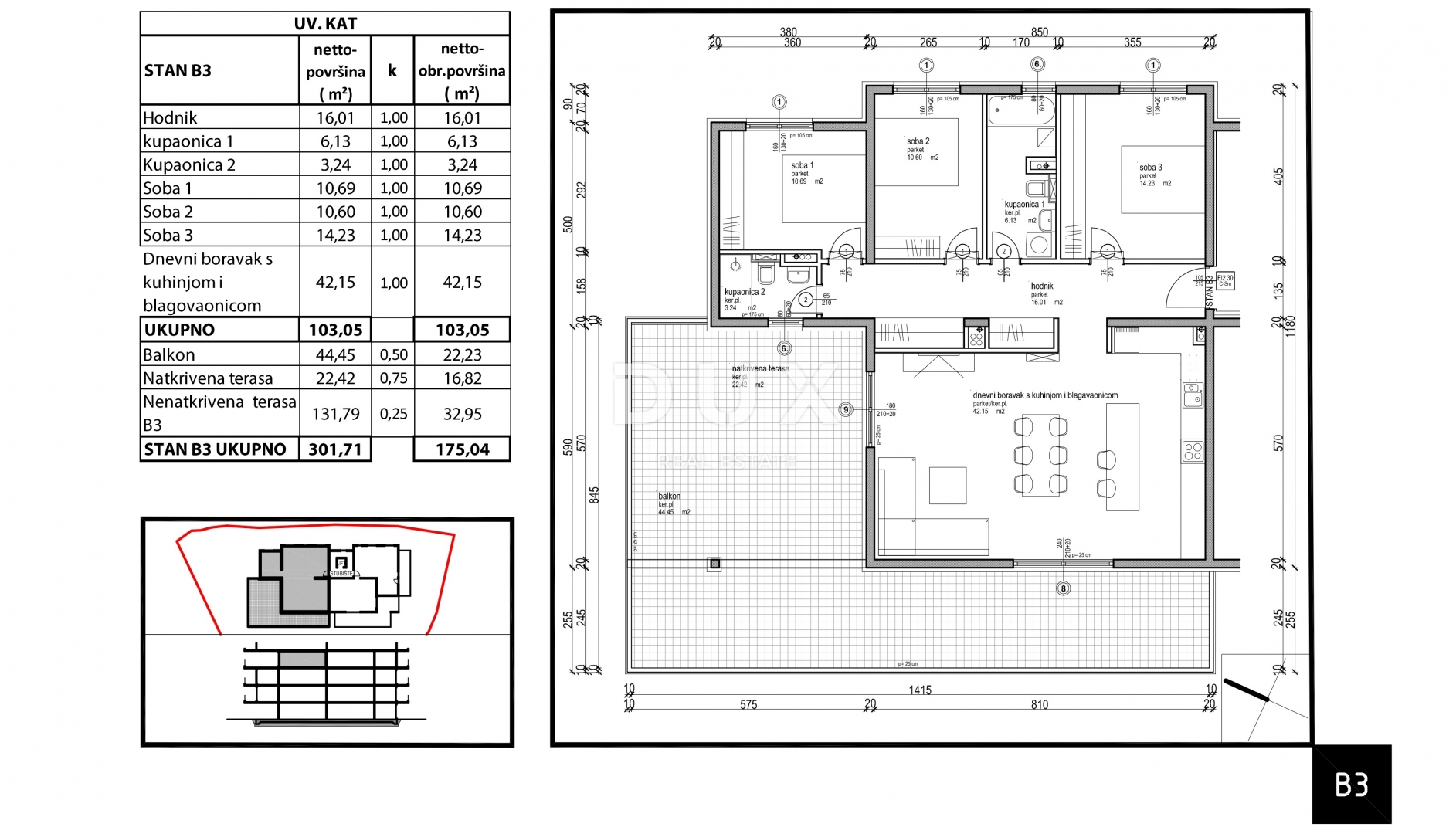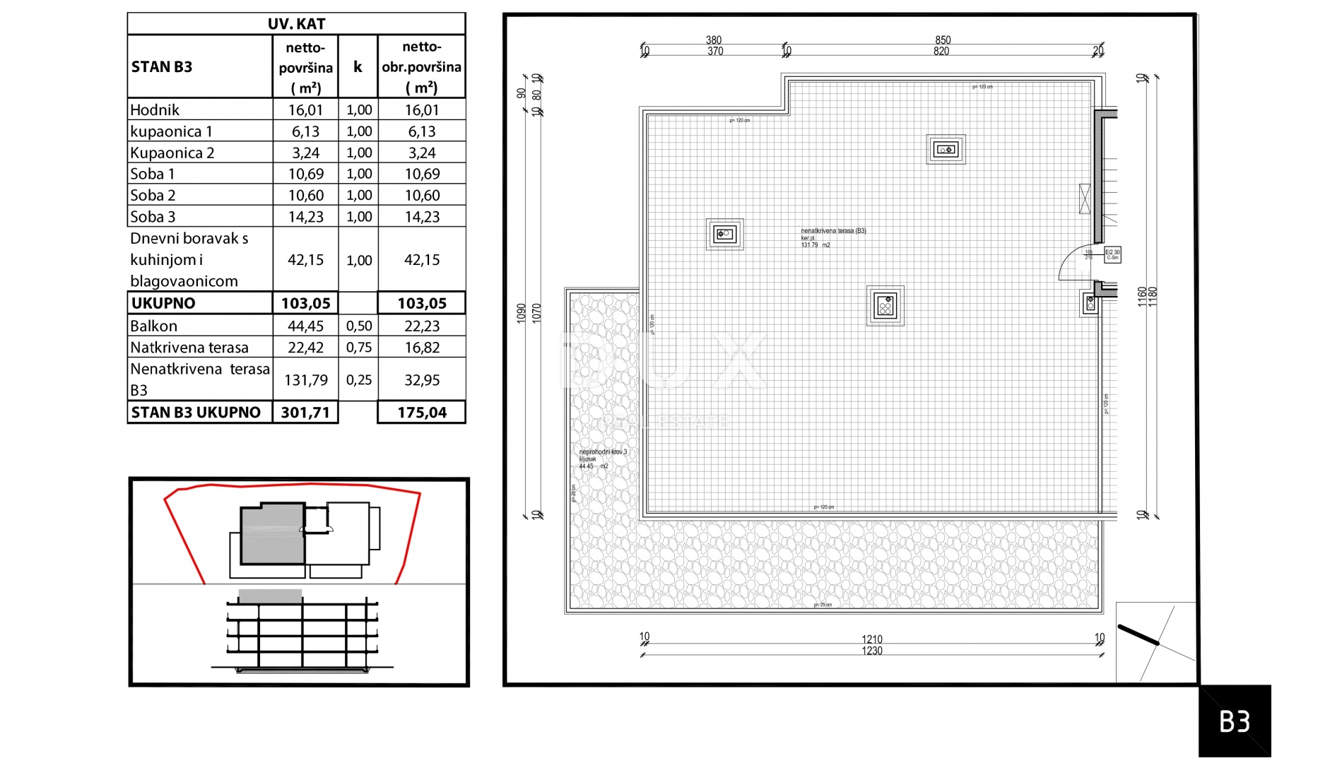 In the quiet settlement of Tara, just 350 m from the sea and a ten-minute walk to the well-maintained beaches, there is a modern new building of top quality with a total of 13 apartments. On the very third floor of the building is this unique two-storey penthouse, which extends over 175.04 m² of living space and represents a combination of luxury, comfort and a superb view. APARTMENT DESCRIPTION - B3 First floor: * spacious entrance hall with a designated cloakroom * large open space area of as much as 42.15 m² with a living room, kitchen and dining room, and where there is also access to a spacious, partially covered terrace that stretches the width of the entire apartment. * three spacious bedrooms. * then two modern and comfortable bathrooms. Second floor: An internal staircase leads to the roof terrace of 131.79 m², which offers a panoramic and unobstructed view of the sea and the Istrian landscape....