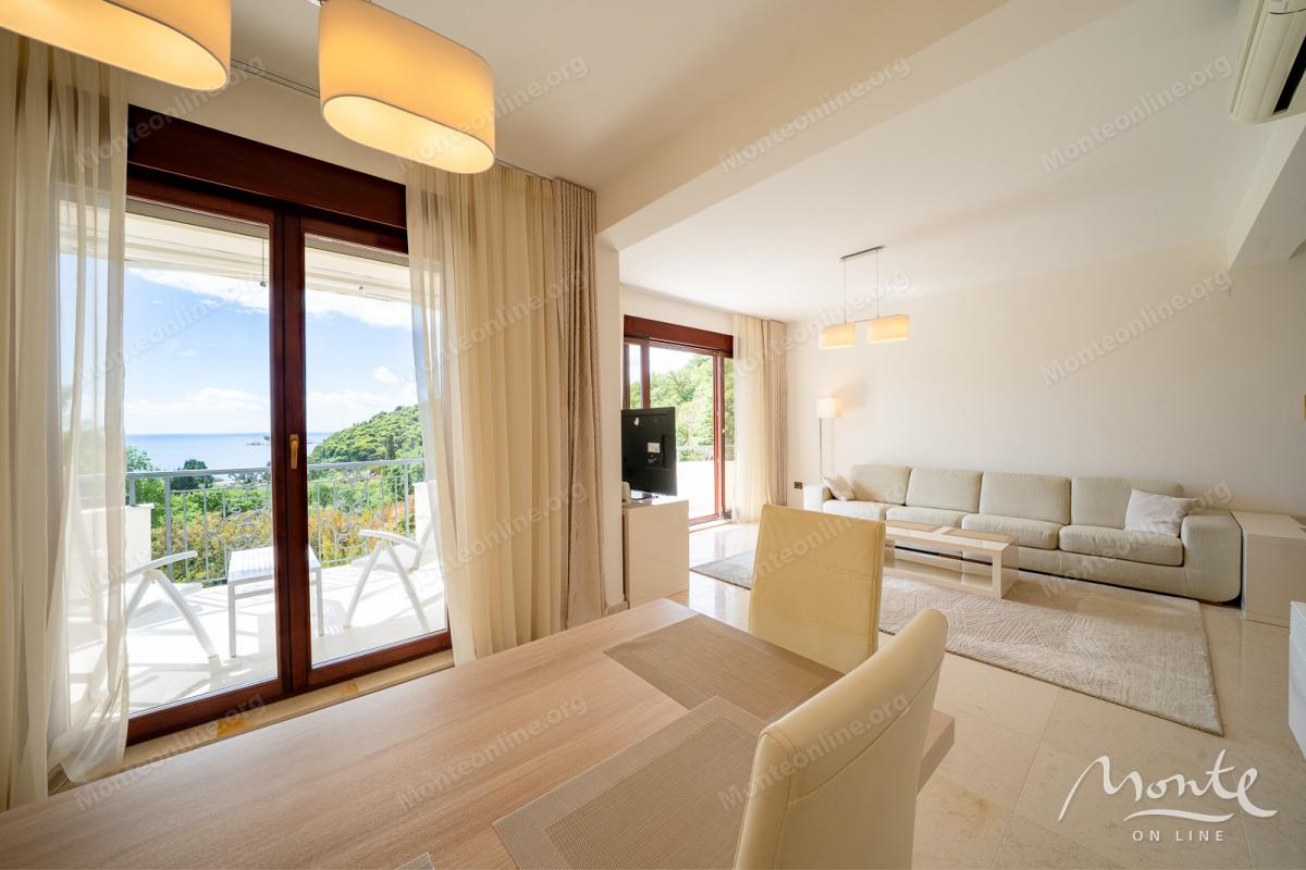 Description (Croatian): Moderan namješten dvosoban stan u premium kompleksu iznad plaže Lučica, Petrovac. Stan se nalazi na drugom spratu (tri sprata iznad nivoa zemlje) i sastoji se od dnevnog boravka, kuhinje, dvije spavaće sobe, dva kupatila i terase sa panoramskim pogledom na more.