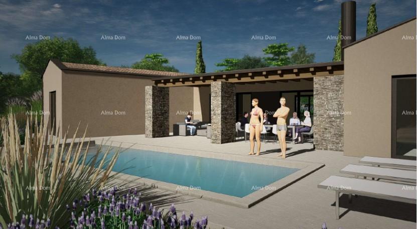 Description: For sale is a building plot with a project for the construction of a modern villa, located in the heart of Istria, between the picturesque towns of Gračišće, Lindar, and Žminj. The location is situated on a gentle hill surrounded by an oak forest, ideal for those seeking peace, nature, and privacy.