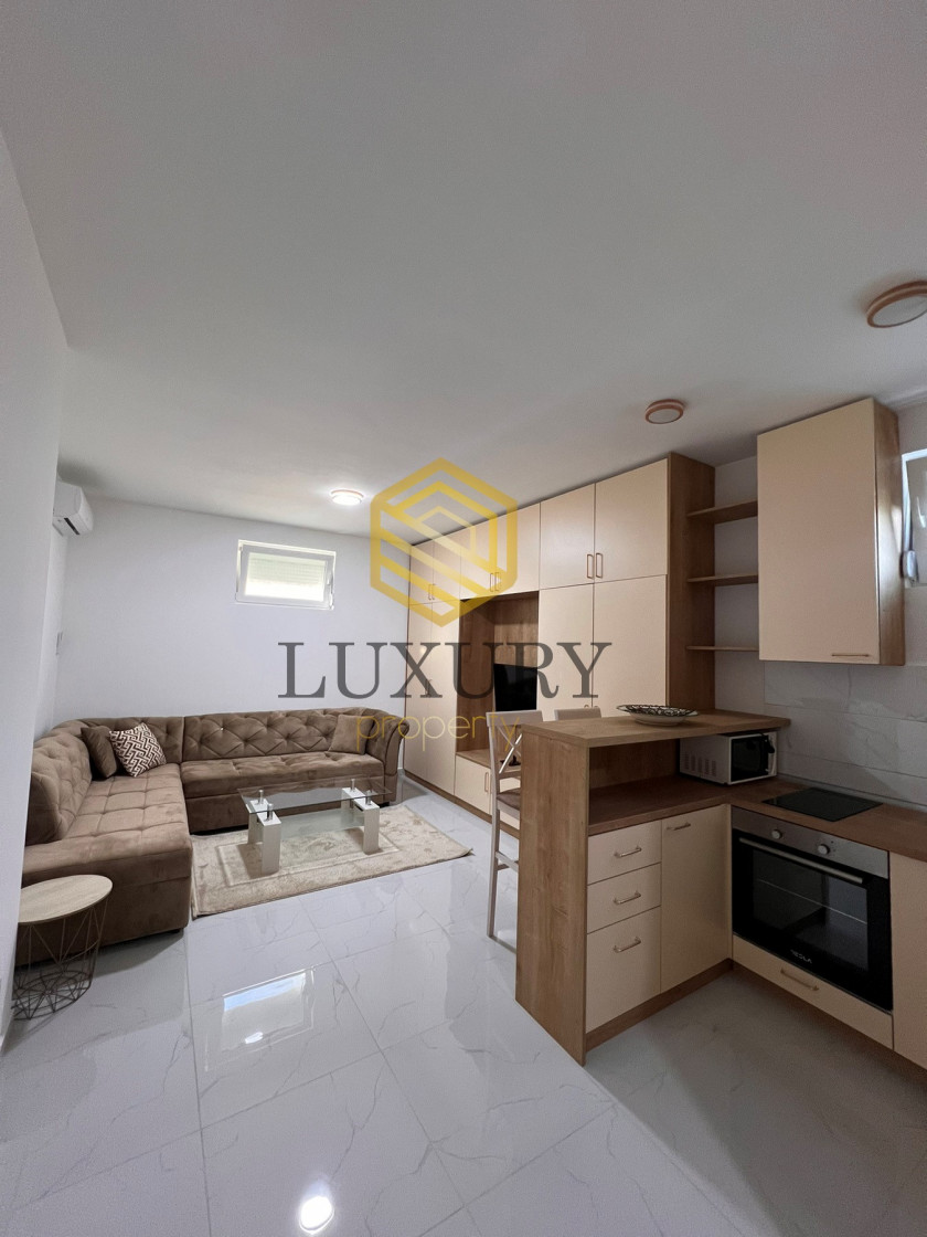 Smejstena je u polusuterenu stambene zgarde.Sastoji se od dnevnog boravka, kuhinje, hodnika, kupatila. Garsonjera je komplet opremljena sa svom tehnikom,posjeduje masinu za sudje,masinu za ves I susenje jer nema terasu.
