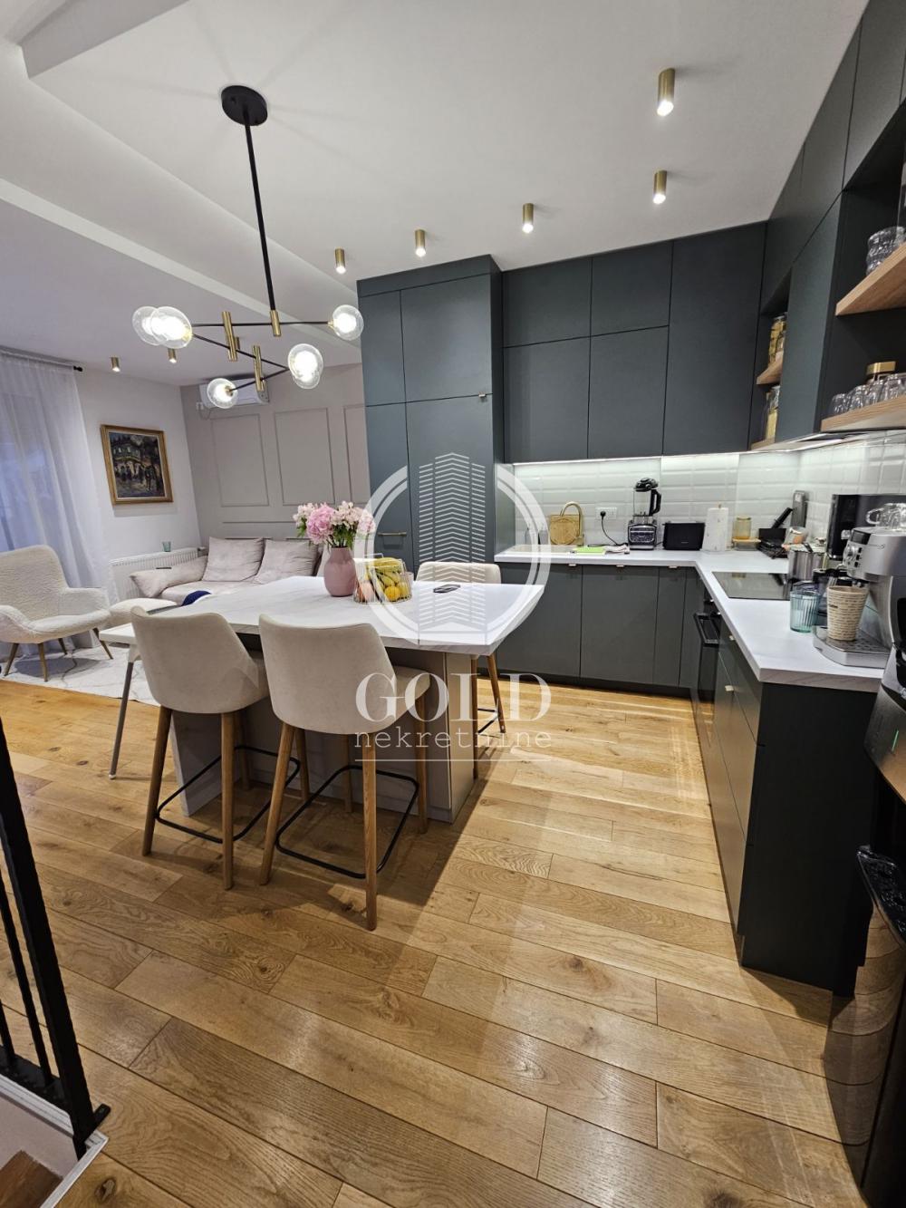 Gornja etaža: Komforan dnevni boravak povezan sa kuhinjom i trpezarijom, dve spavaće sobe standardne veličine i moderno kupatilo.