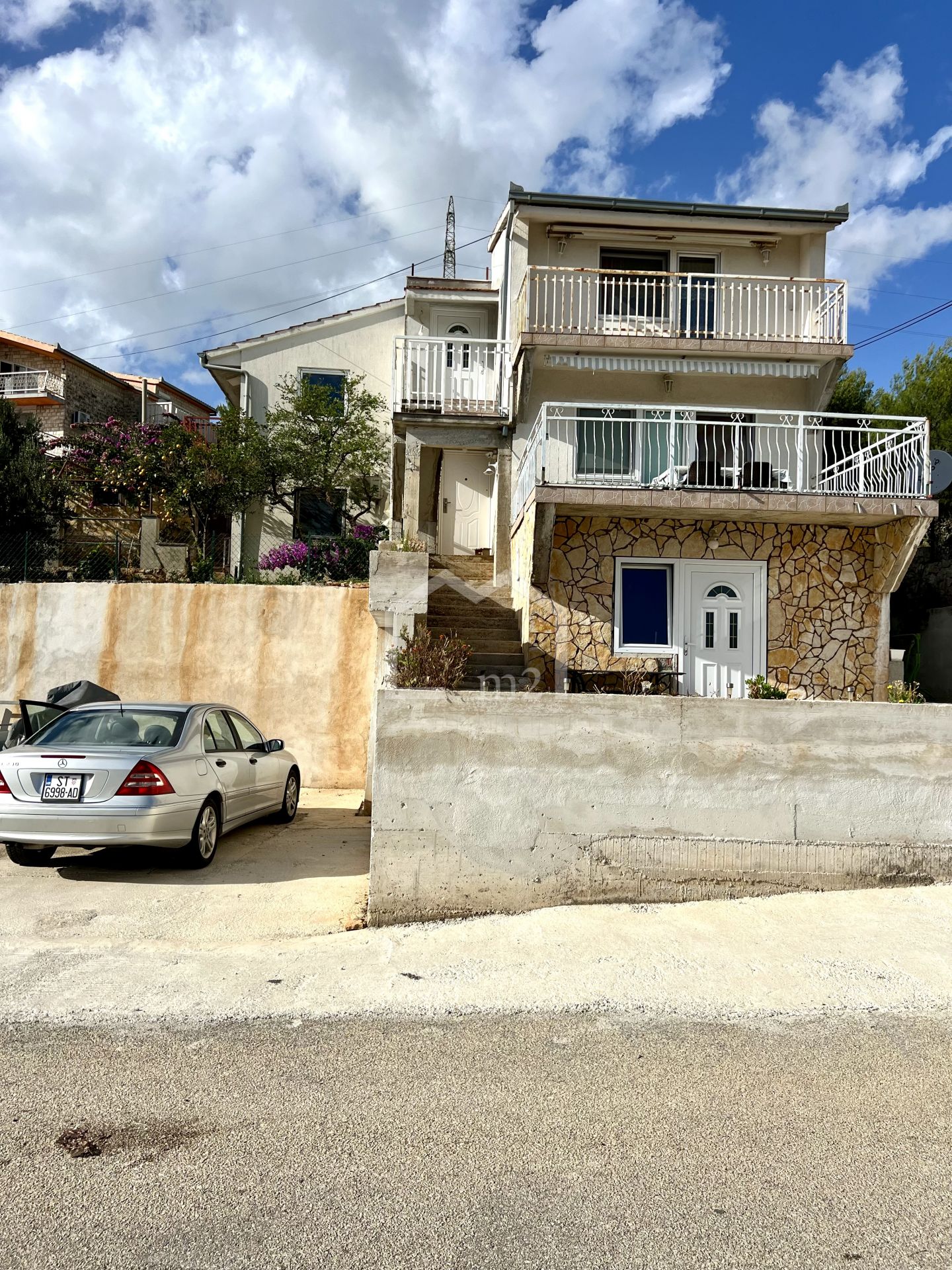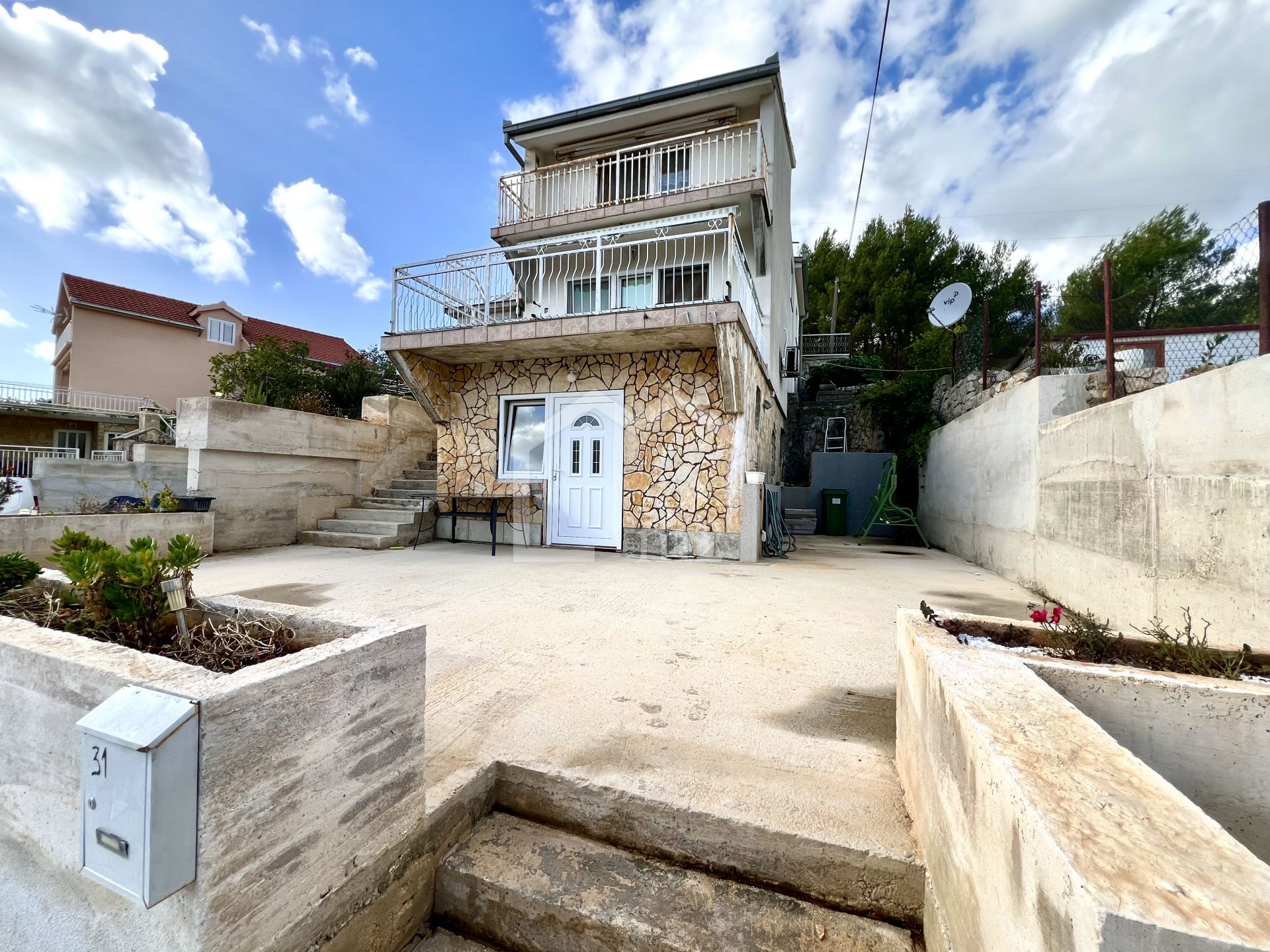 Description (Croatian): Posredujemo u prodaji dvojne kuće u Marini kod Trogira sa predivnim pogledom na more i Marinu. Kuća se sastoji od suterena, prizemlja i prvog kata. U suterenu su smještene kuhinja s blagovaonicom, dnevni boravak, kupaonica, spavaća soba te terasa. U prizemlju se nalaze dvije spavaće sobe, kuhinja i blagovaonica, kupaonica, ostava te velika terasa sa koje se pruža lijepi pogled na more. Na prvom katu se nalaze dvije spavaće sobe, hodnik, kuhinja, dnevni boravak i blagovaonica, kupaonica, ostava te balkon. Svaki kat je odvojen vanjskim skalama i ima pogled na more. Nekretnina je idealna kao investicija za turizam ili kao kuća za obiteljski život. Nalazi se u blizini mora, centra i svih ostalih sadržaja. Vlasništvo uredno.