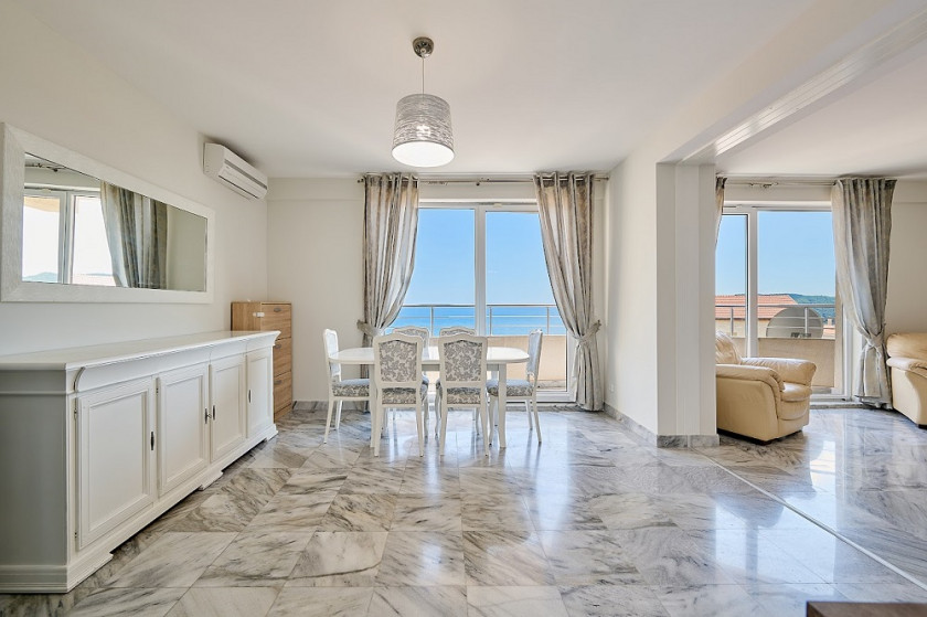 Sa ukupnom površinom od 113 m², stan se nalazi na 3. spratu i ima dobro osmišljen raspored koji uključuje 3 spavaće sobe, 3 kupatila, vešeraj, kao i prostrani dnevni boravak spojeni sa kuhinjom. Prostrana terasa sa pogledom na more i dodatna terasa sa pogledom na planine nude idealne uslove za odmor i uživanje u okolnoj ljepoti.
