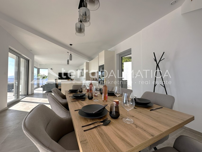 Description: For sale is a beautiful villa near Omiš, located by the sea and surrounded by the crystal clear Adriatic Sea and untouched nature. On the ground floor there is a spacious living room connected to the kitchen and dining room, from which there is a beautiful panoramic view of the Adriatic Sea and the island of Brač. There is also one bathroom on the same floor. The entire space is dominated by large glass walls that give the space plenty of light and open up the view of the sea from every point. In front of the villa there is a spacious terrace with a swimming pool, an outdoor dining room, a lounge area for relaxing and socializing, and a sunbathing area with deck chairs. Behind the villa there is an outdoor summer kitchen and a storage room. On the first floor there is a hallway that leads to three bedrooms. Two of the bedrooms have access to a terrace with a stunning view of the sea, an ideal place for morning coffee, evening socializing or watching the starry sky. The third bedroom has access to the back terrace from which you can also see the sea, on both sides. This villa also has a garage and a storage room....