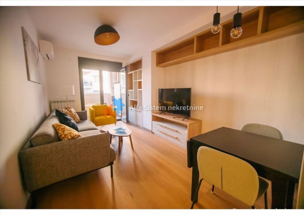 Description (Croatian): Na raspolaganju je potpuno nov i moderno opremljen stan površine 45 m², smešten na prvom spratu kvalitetne novogradnje u blizini Kalenić pijace i Vukovog spomenika. Stan je idealan za dugoročni zakup i odmah useljiv.
