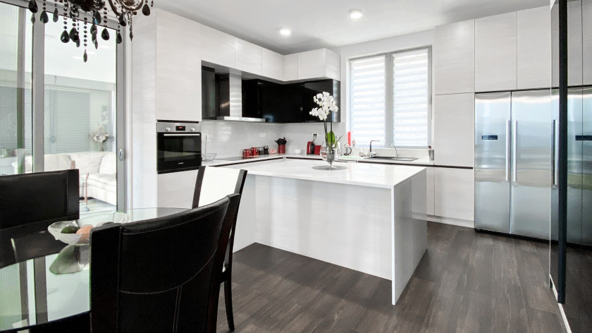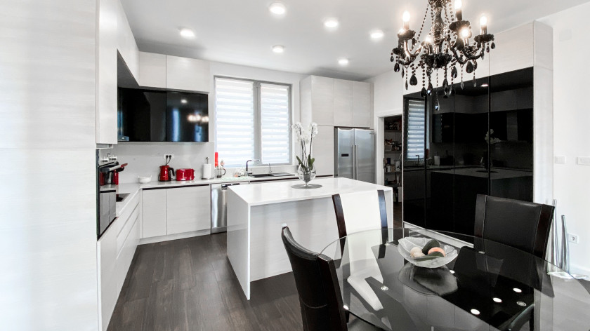 The ground floor consists of: – entrance hall – living room – kitchen and dining room – bedroom/study – 2 bathrooms – laundry room – barbecue area. The unique design of the first floor features a living room with 8-meter-high ceilings and floor-to-ceiling panoramic windows, as well as exclusive interior design solutions.